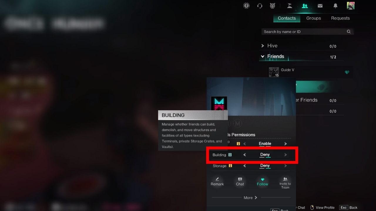 You can repeat this process with others on your Once Human friends list so they can access your building permissions. Or, if you’d like to revoke access, choose the disable option next to the building permissions.