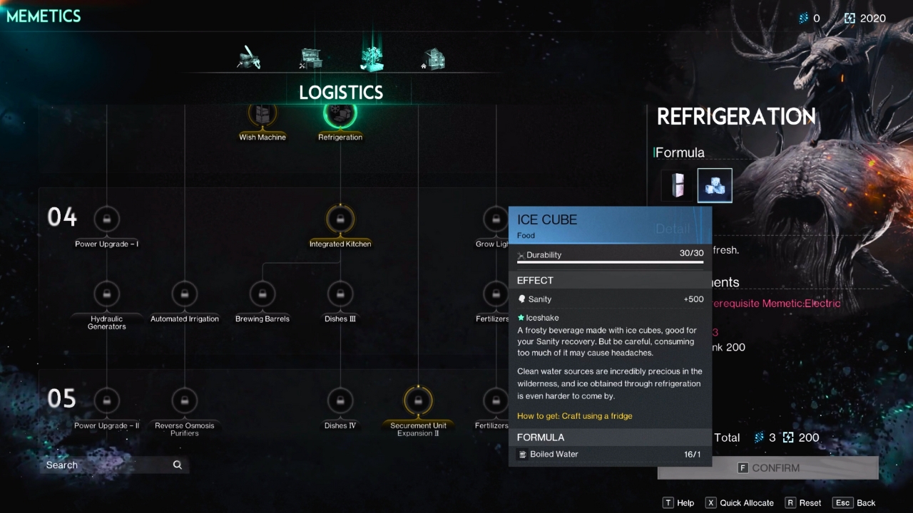 But as you earn Memetics Points, you can unlock various nodes that provide blueprints for items that give Sanity. One example is Refrigeration in the Logistics tree. If you unlock this, you can make Ice Cubes, which grant you Sanity.