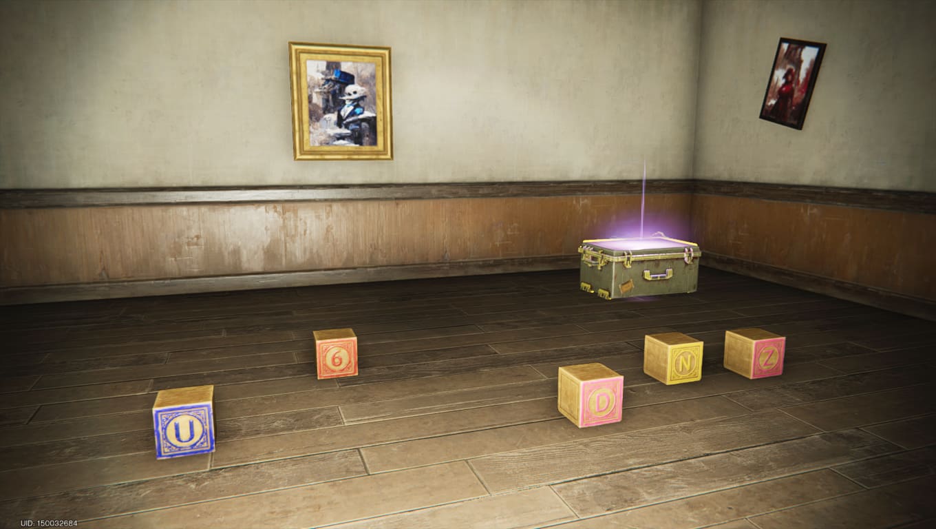 You should spot three building blocks in front of you and you must flip them in the right order to show the code U-6-P as per the first note. You can interact with the three highlighted cubes to flip them and make them show the code facing you to solve the puzzle.