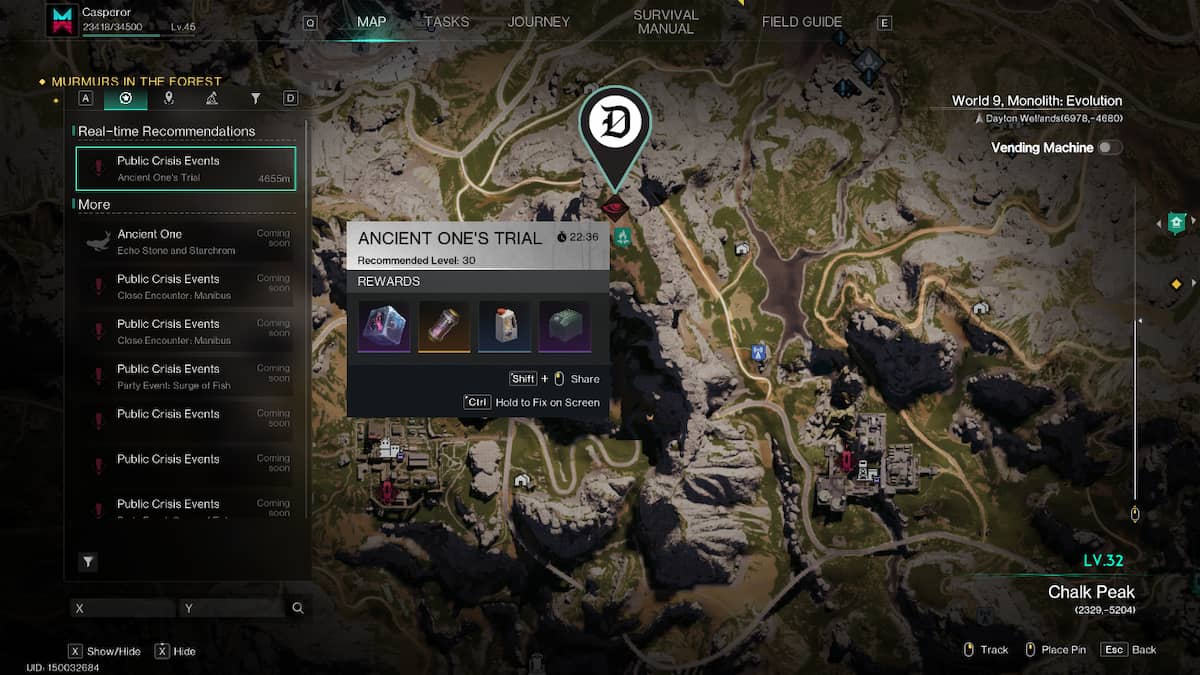 To start the Ancient One’s Trial in Once Human, you have to embrace the heights of the mountains of the Chalk Peak region. You can open your map and press X to reveal all the public crisis events that are currently happening. In the Chalk Peak region, you need to find the highest mountain roughly at (coordinates: 2329,-5204), then take the nearby teleporter.