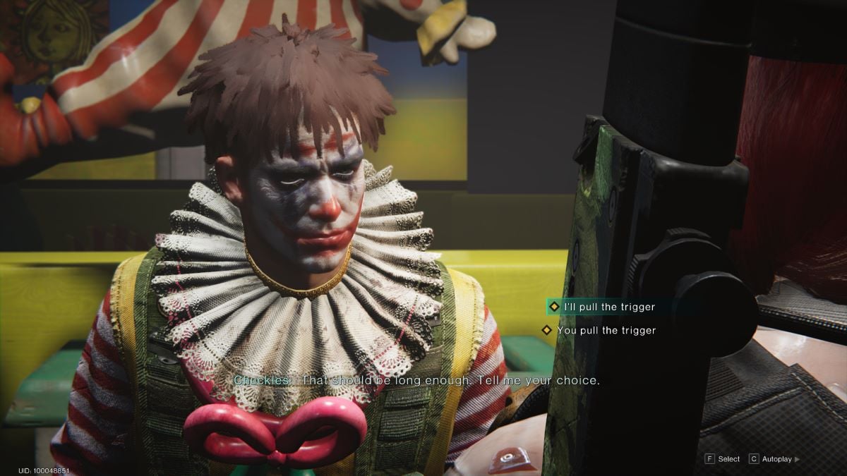 I don’t want to spoil what happens in the cutscene, but immediately after it concludes your task will be clear. There’s one bullet in the revolver, and you get to decide whether you’re going to pull the trigger yourself or let Chuckles do the honors. Here’s the thing—regardless of your choice, Chuckles will win.