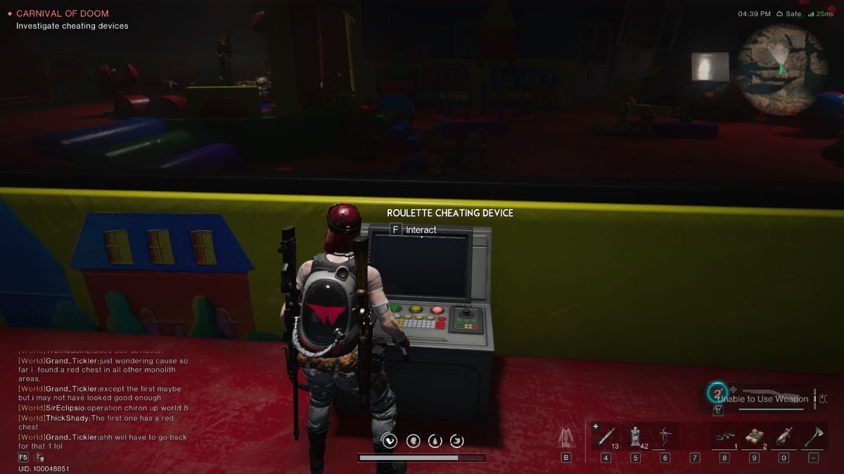Now, I’m not certain either option will assuredly win the game after you’ve gotten rid of the clown on the cheating device. Personally, I opted to be the one firing the gun, and this won the game for me. Because you can’t repeat quests in Once Human, I’m not entirely sure what happens if you let Chuckles hold the gun. If you want to play it safe and make sure you win the roulette, select the option “I’ll pull the trigger.” If you’re feeling lucky, go ahead and let Chuckles hold the gun… just don’t blame me if it blows up in your face.