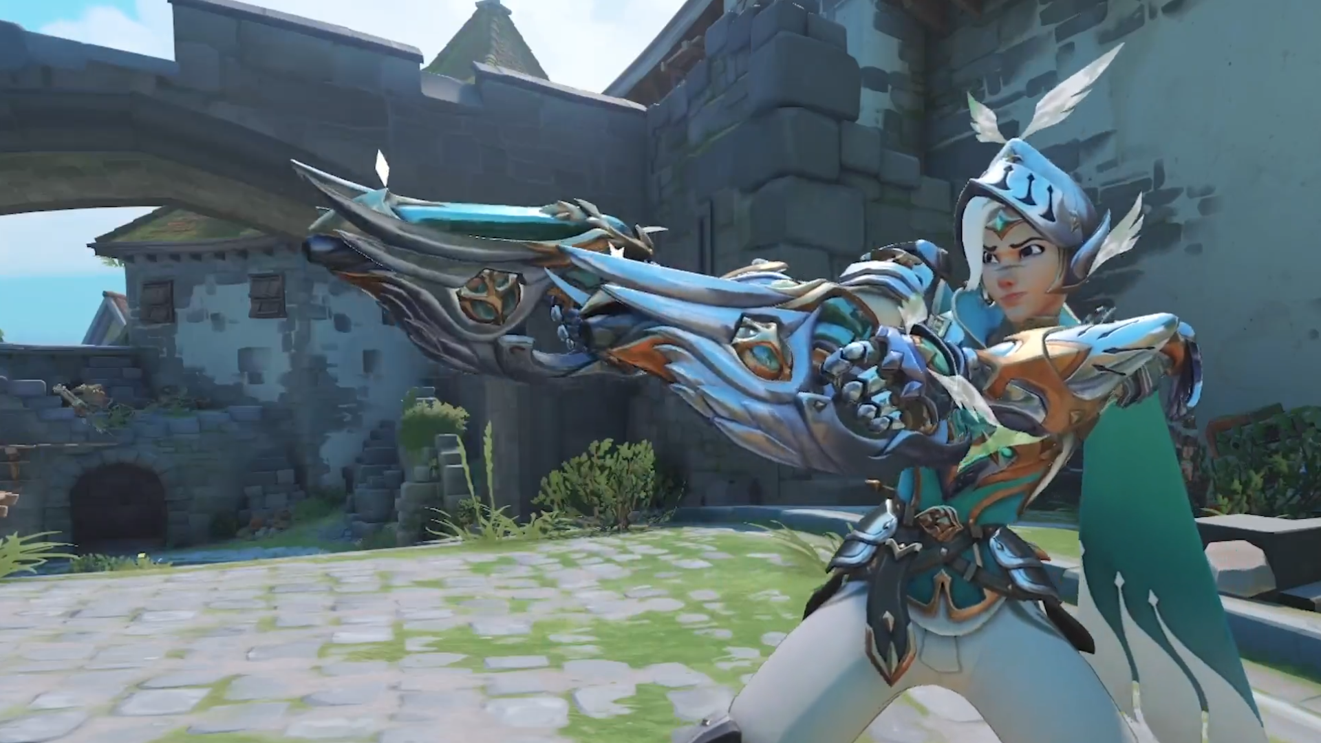 The three color options will be a red with black, blue with brown, and teal with white. The teal with white option looks like it will probably come at the end of the skin progression. Tracer’s Mythic headpieces will be a hood (akin to an Assassin’s Creed character), tiara, and a knight’s helmet with wings.