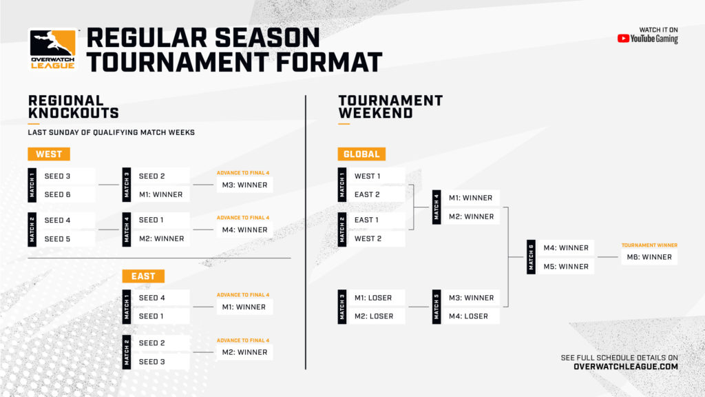 Since the league is divided into two regions, East and West, teams will have to play knockout matches in their respective regions to advance to the double-elimination global bracket. For each tournament, the top-six West teams will play knockout matches, while only the top-four East teams will do so.