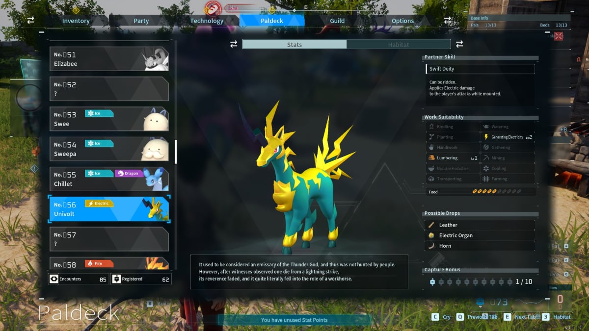 Univolt is the best land mount to catch if you’re in the earlier stages of the game. Not only does it offer a decent amount of pure speed, but it also boasts a solid jump animation that makes traversing Palworld’s map a bit easier than, say, a Direhowl. All in all, Univolt is a great land mount and an easy way to farm Leather, Horns, and Electric Organs to boot.