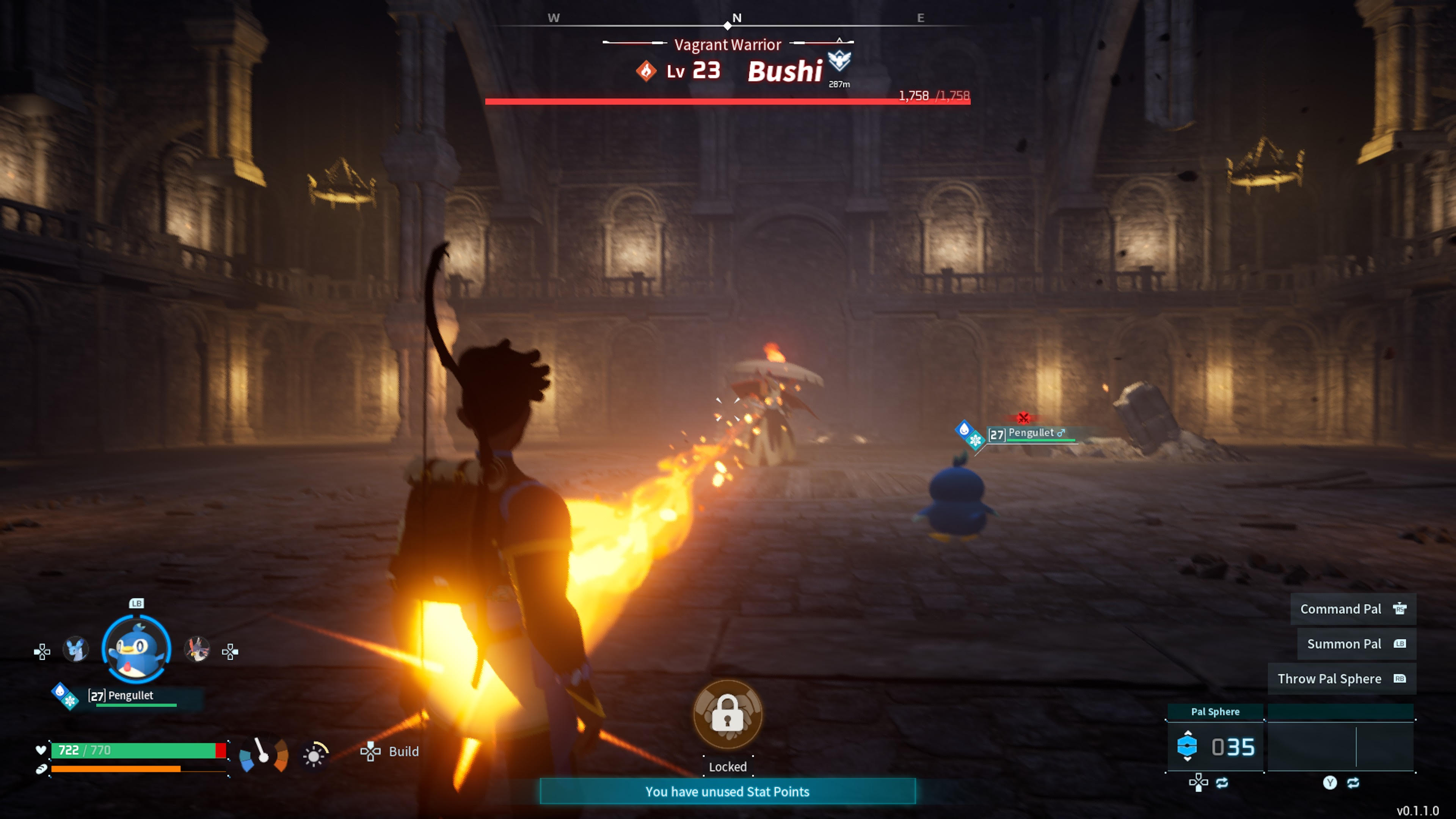 Open this fight by tossing your best Water-type Pal into battle. While they do the work, hang back and launch your ranged attacks at Bushi while dodging any fireballs that come your way. Keep in mind where you are on the battlefield because there are pillars that can be used as cover. These are very handy and should be taken advantage of any time you need to switch Pals or do any healing.