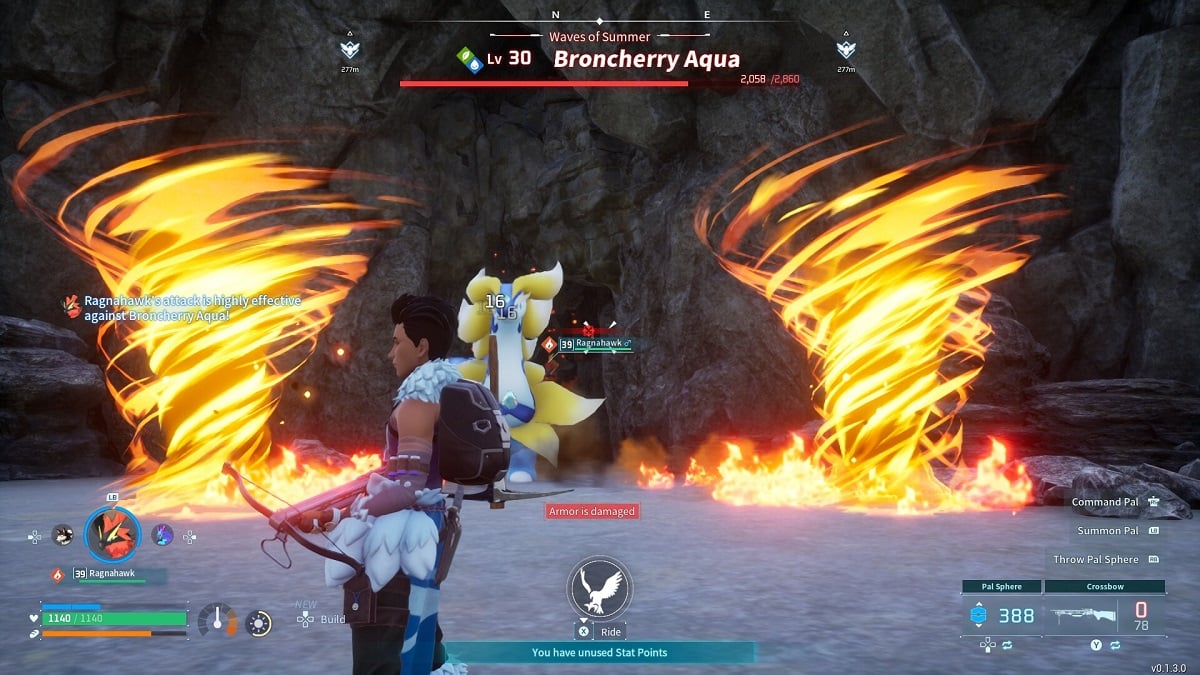 Speaking of weapons, since Broncherry Aqua is level 30, you’ll want to at least be at a point where you can make guns since you can do more damage than you would with a bow and arrows. As long as you’re at level 30 yourself, you’ll have access to the Makeshift Handgun and Hangun in the Technology Tree. Broncherry Aqua’s dual Grass/Water typing also means it’s weak to both Fire and Electric attacks, so bring at least one Pal of each type, just in case one of them gets knocked out during the fight. I’d recommend Arsox for Fire and Dazzi for Electric, especially since you can have both out at the same time if you’ve built Dazzi’s Necklace. If you’be already caught a Mossanda Lux, that can help too, being both Electric type and equipped with a grenade launcher if you’ve unlocked its Partner Ability.
