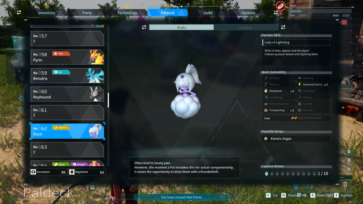 - Paldeck Bio: “Often kind to lonely pals. However, the moment a Pal mistakes this for actual companionship, it seizes the opportunity to blast them with a thunderbolt.”