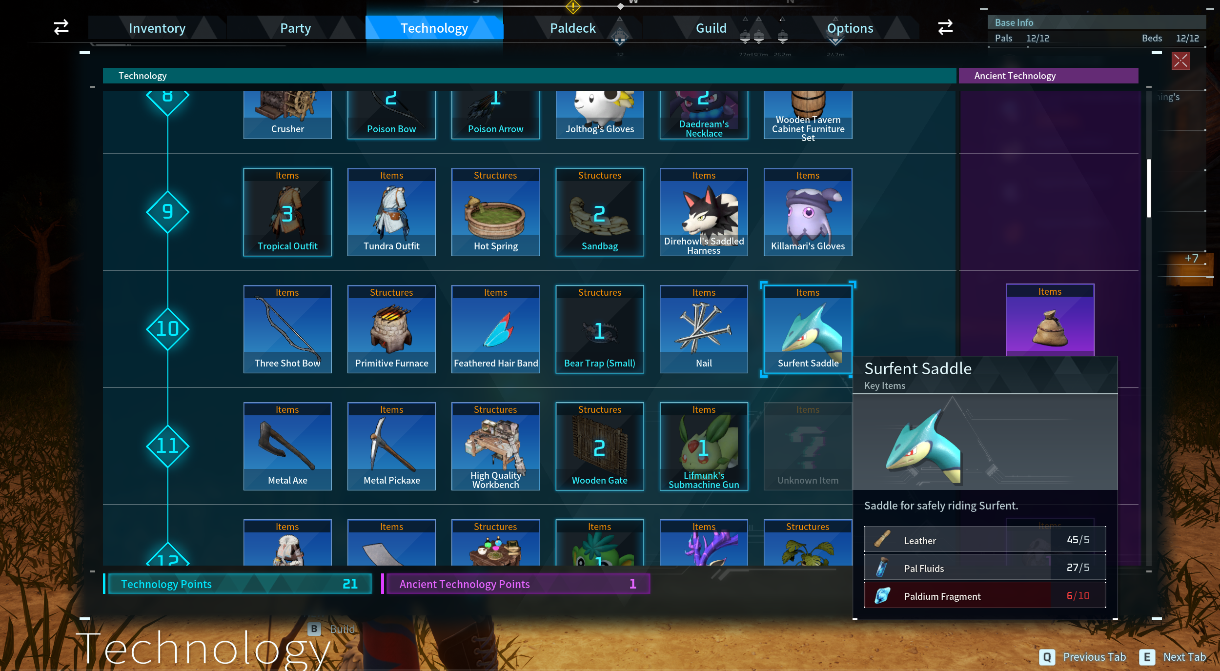 Before you can ride the waves with Surfent, you need to unlock the ability to craft a Surfent Saddle from the Technology tree at level 10 with one Technology Point. Once you have it unlocked, head to a nearby Pal Gear Workbench with the following materials: