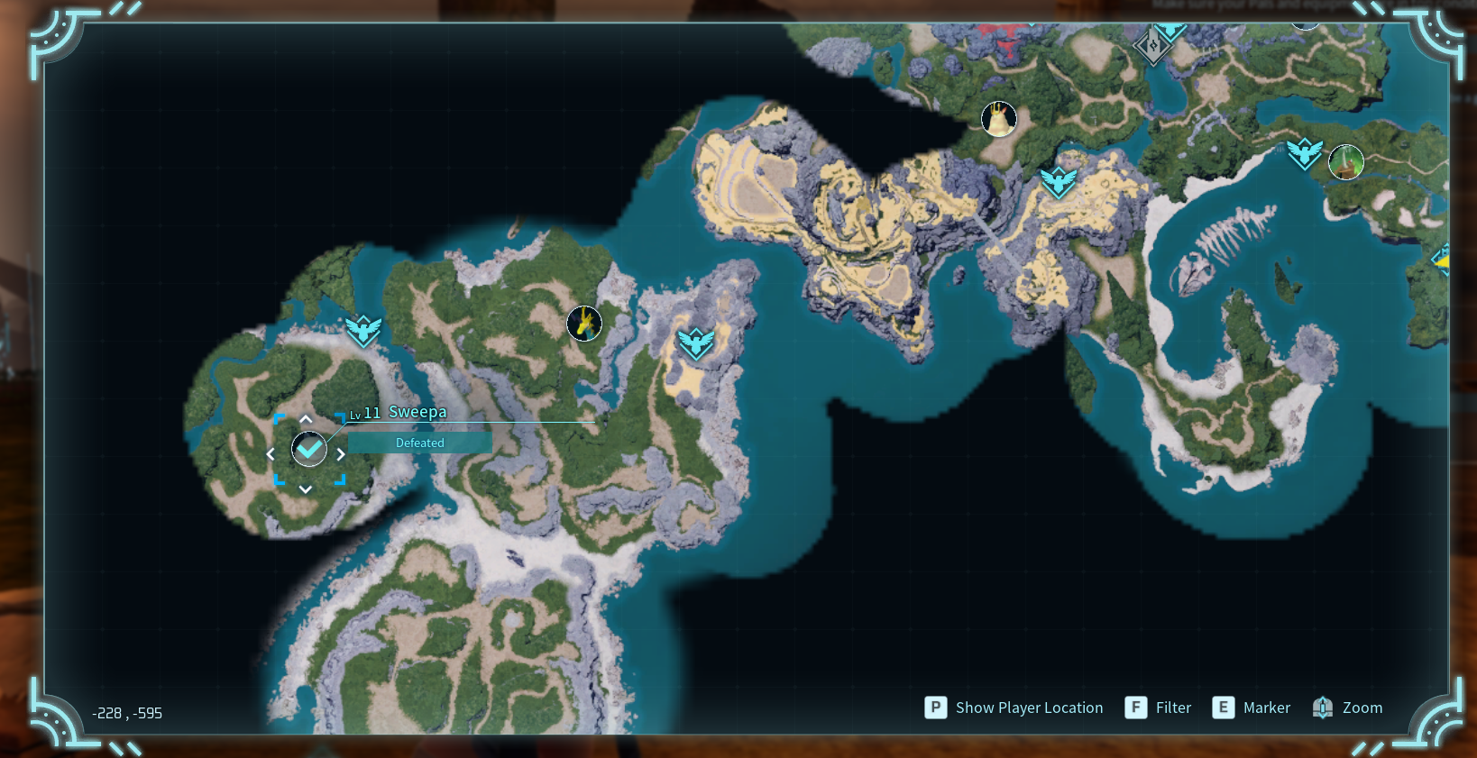 Sweepa’s Pal Deck entry highlights significant portions of the Palworld map as its habitat. But according to my experience, the fluffball spawns outside its habitat—just not as commonly. I suggest visiting the highlighted portions of the map for a definitive chance to run into Sweepa and its cute little Swees. If you’re looking to farm an Ancient Technology point, you can give the Sweepa boss location near Small Cove a visit, too.