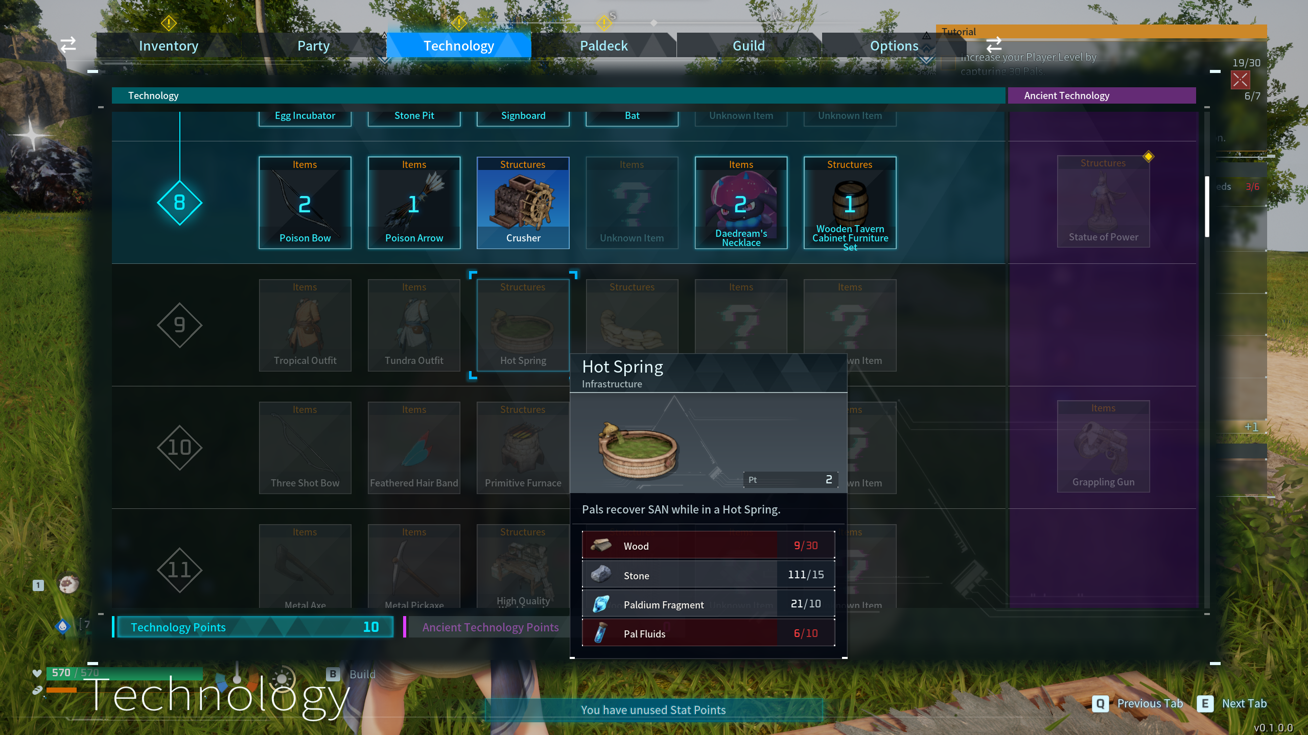 If the row the Hot Spring is located in is greyed out, that means you need to level up before you can unlock the Technology. Every time you level up your character, you unlock the Technology row that corresponds to it. For example, to unlock the ability to build the Hot Spring, which is on the ninth row, you need to be level nine.
