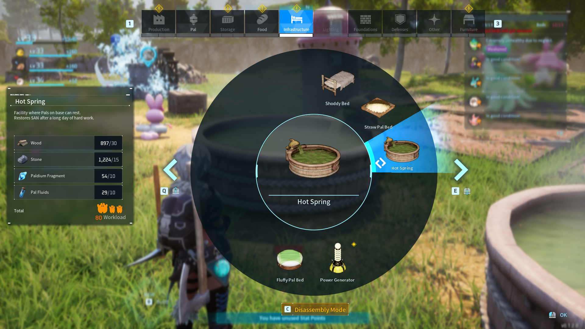 Hot Springs in Palworld allow your Pals to recover sanity (SAN). They lose SAN from working around your base, and if the stat drops low enough, they’ll gain the Depressed status. Hot Springs are an easy fix for this effect, but you’ll need to level up and harvest a few resources before you can build a Hot Spring in your base.