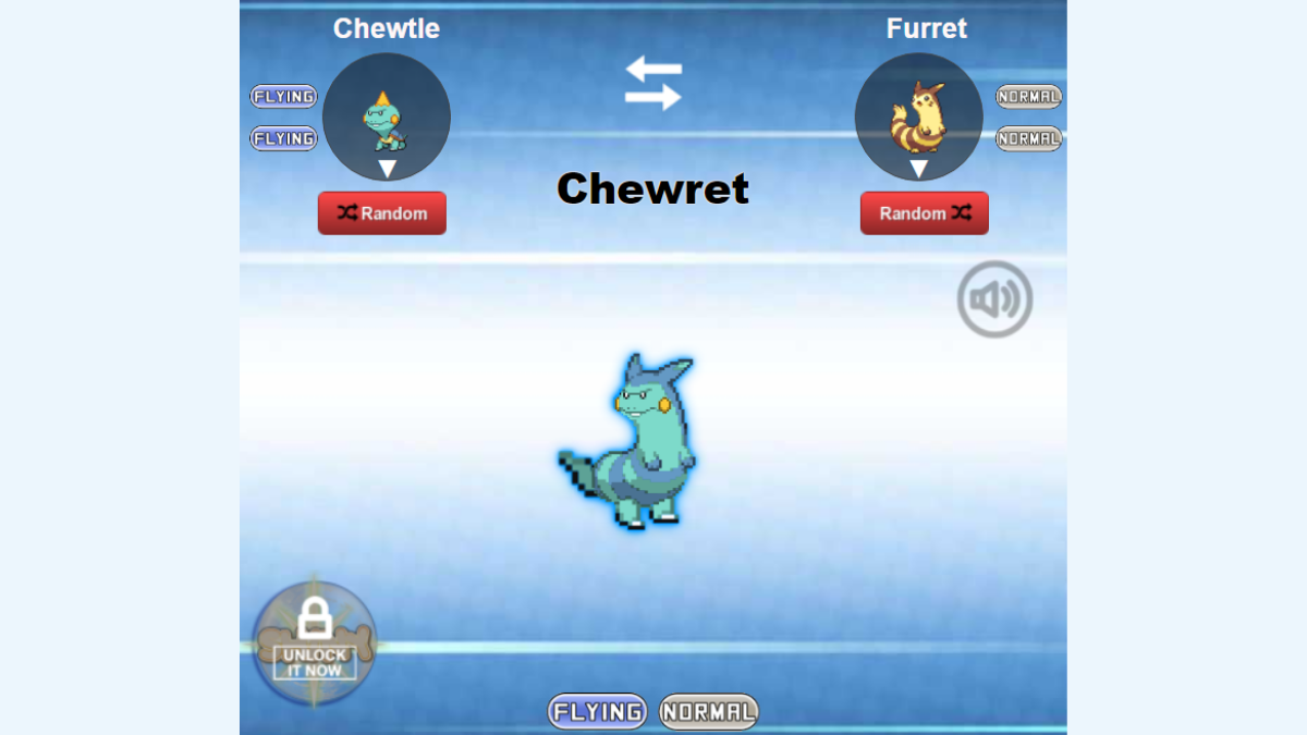 Here, in the final fusion, I looked at an Ice-type combo. Chillet is the same shape as the adorable Furret, which may be why their names also sound similar. Since Chillet is part Ice-type, I thought it would work well with the Ice fossil Pokémon, Amaura and Aurorus, who also share the same blue coloring. I didn’t care too much for those, so I tried a different approach—finding a fused name that sounded similar to Chillet. That’s how we ended up with Chewret, a fusion of Chewtle and Furret. At least it’s blue and the same shape.