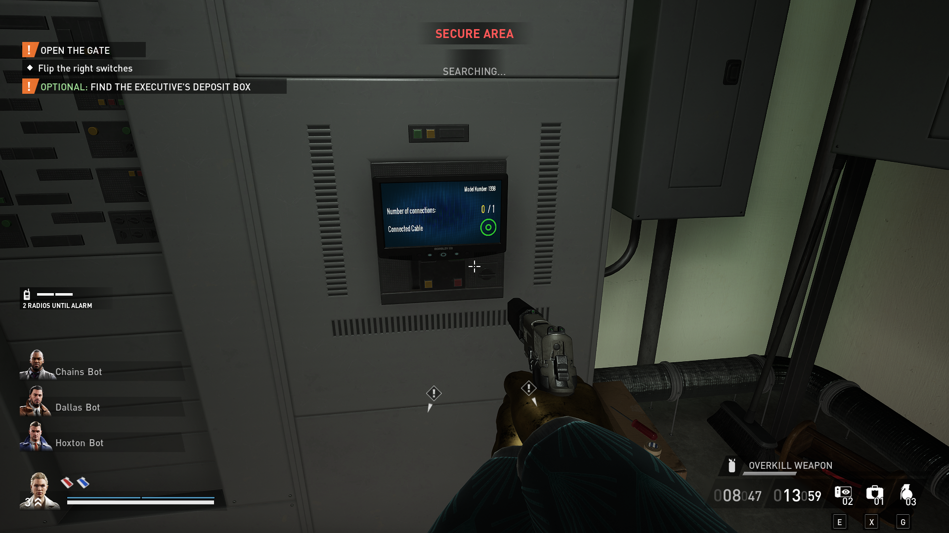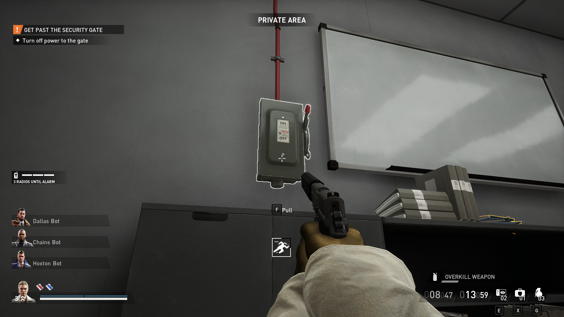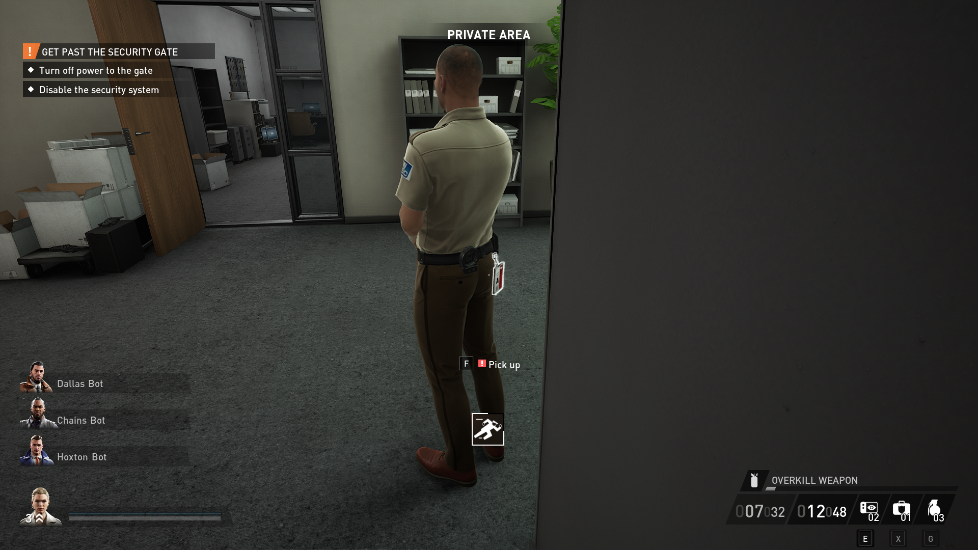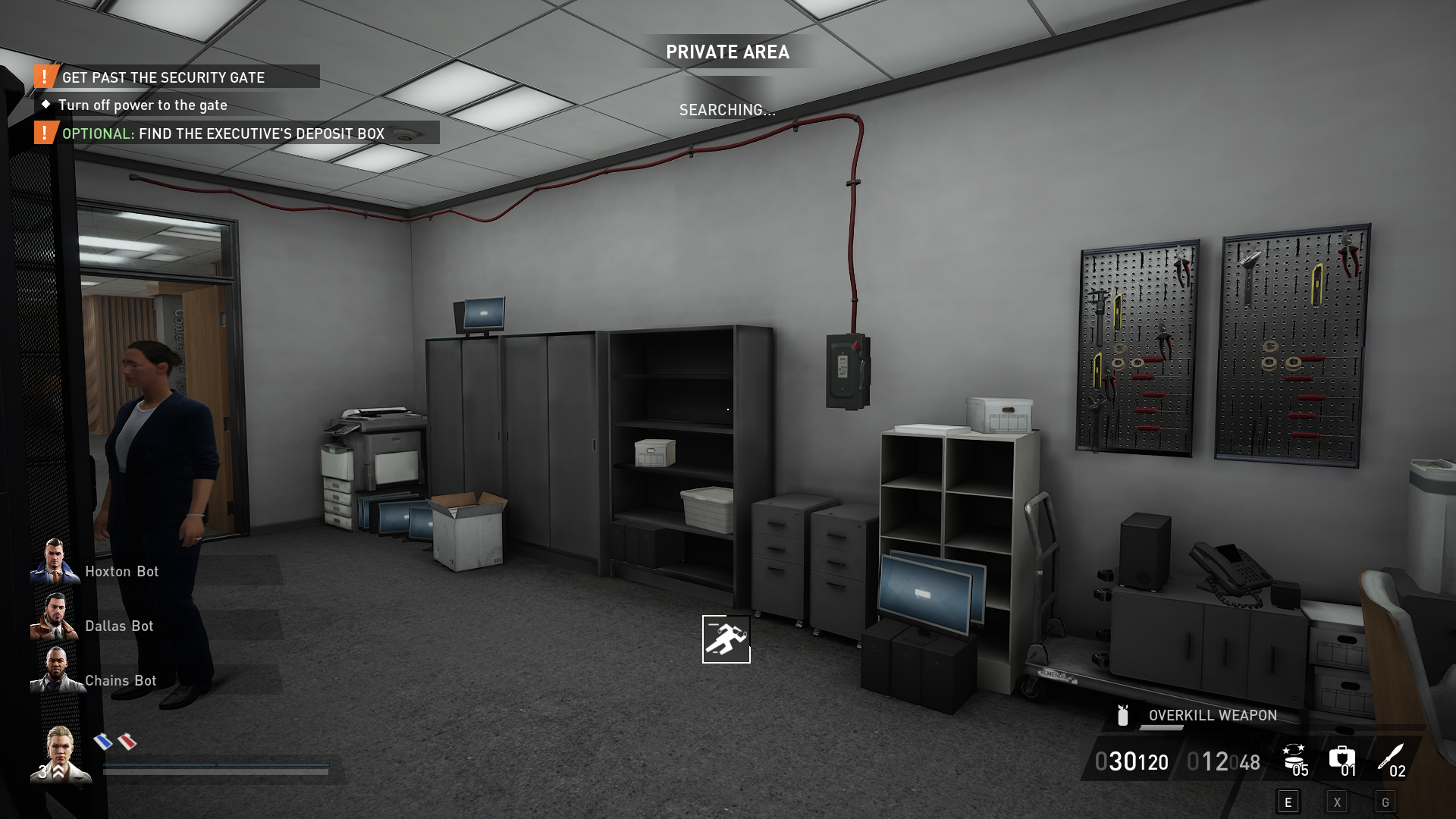 After you’ve done that, find the power fuse box on floor two in the copy machine room next to the cubicles. Flip the switch on the fuse box to turn off the power. While you’re here, search one of the highlighted files to start the executive deposit box side objective. If the fuse box isn’t here, check the IT/Help Room on the first floor. It’s rare, but it can also spawn there.