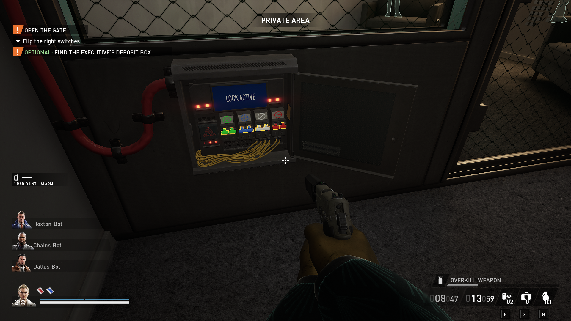 I recommend going back to the roof and down the fire escape, as the door we entered from the parking lot puts us directly next to the vault gate. Open the gate’s lockbox and select whichever color you saw on the Cable Controller in the red keycard room.