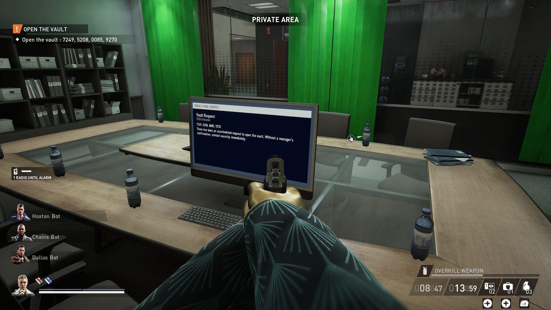 Bring the manager to the door of the vault, and shove him into the eye-scanner. An email will be sent to the computer in the Conference Room, and hacking that computer will give you four possible codes to open the vault. If the files in the Manager’s Office didn’t reveal which deposit box belongs to the executive, the files in here should.