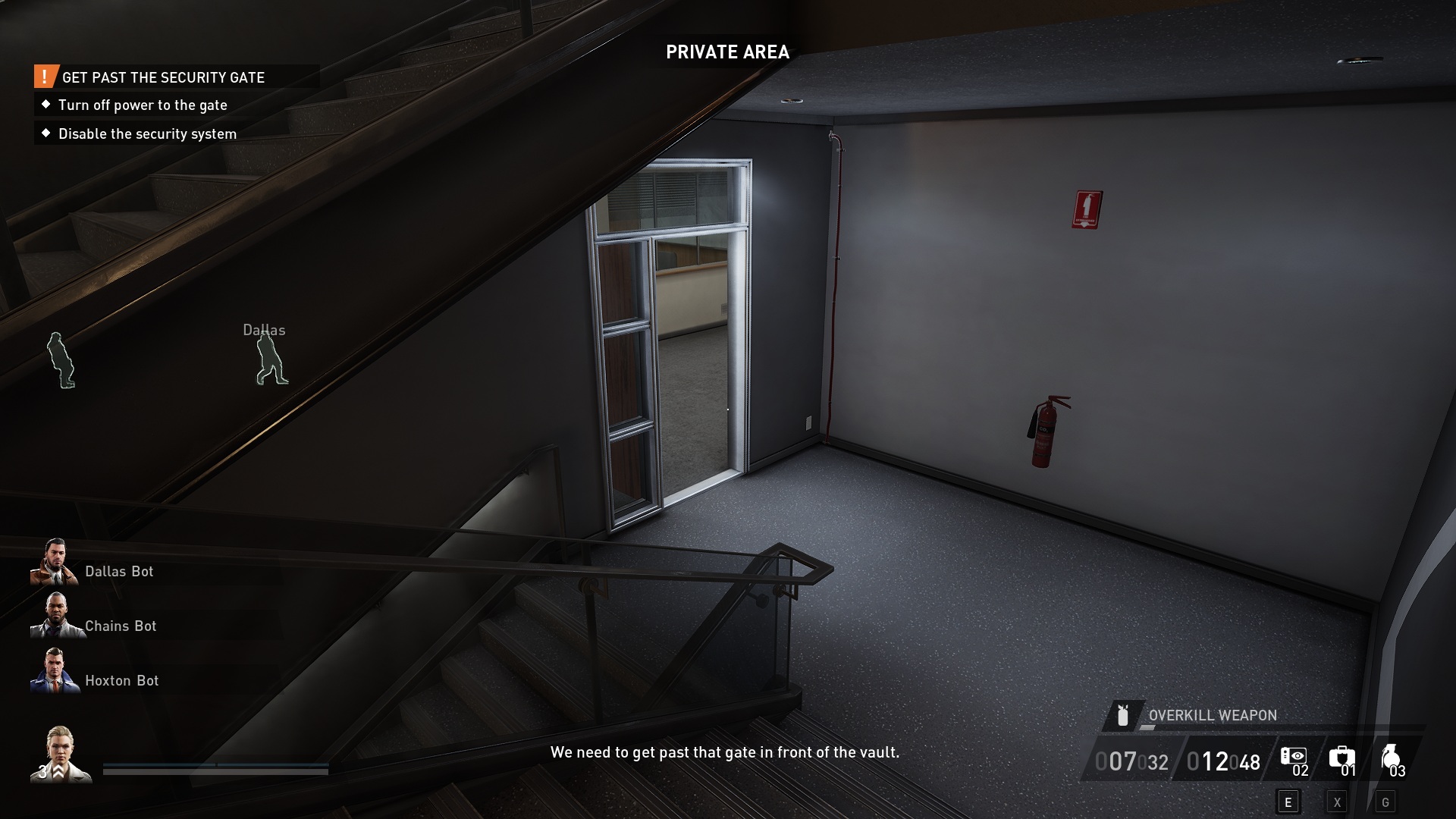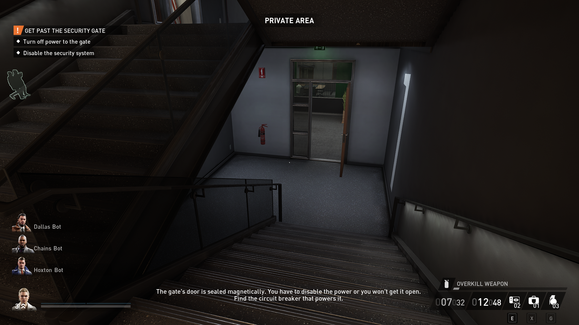 Now that you’ve got the blue keycard, you can shut off the security cameras in the bank, making stealth a hell of a lot easier for the rest of the heist. From the stairwell entrance to the second floor, turn left and walk just a couple of feet. You’ll see a locked door with a blue scanner next to it.