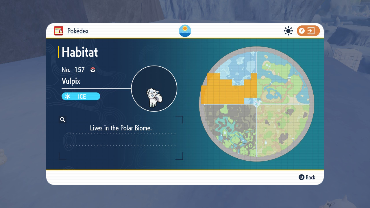 As an Ice-type species, Alolan Vulpix lives in the Polar Biome, the northwestern quadrant of the Blueberry Academy’s Terrarium. More specifically, I found my Vulpix on a cliffside overlooking the Polar Plaza, as shown on the map below.