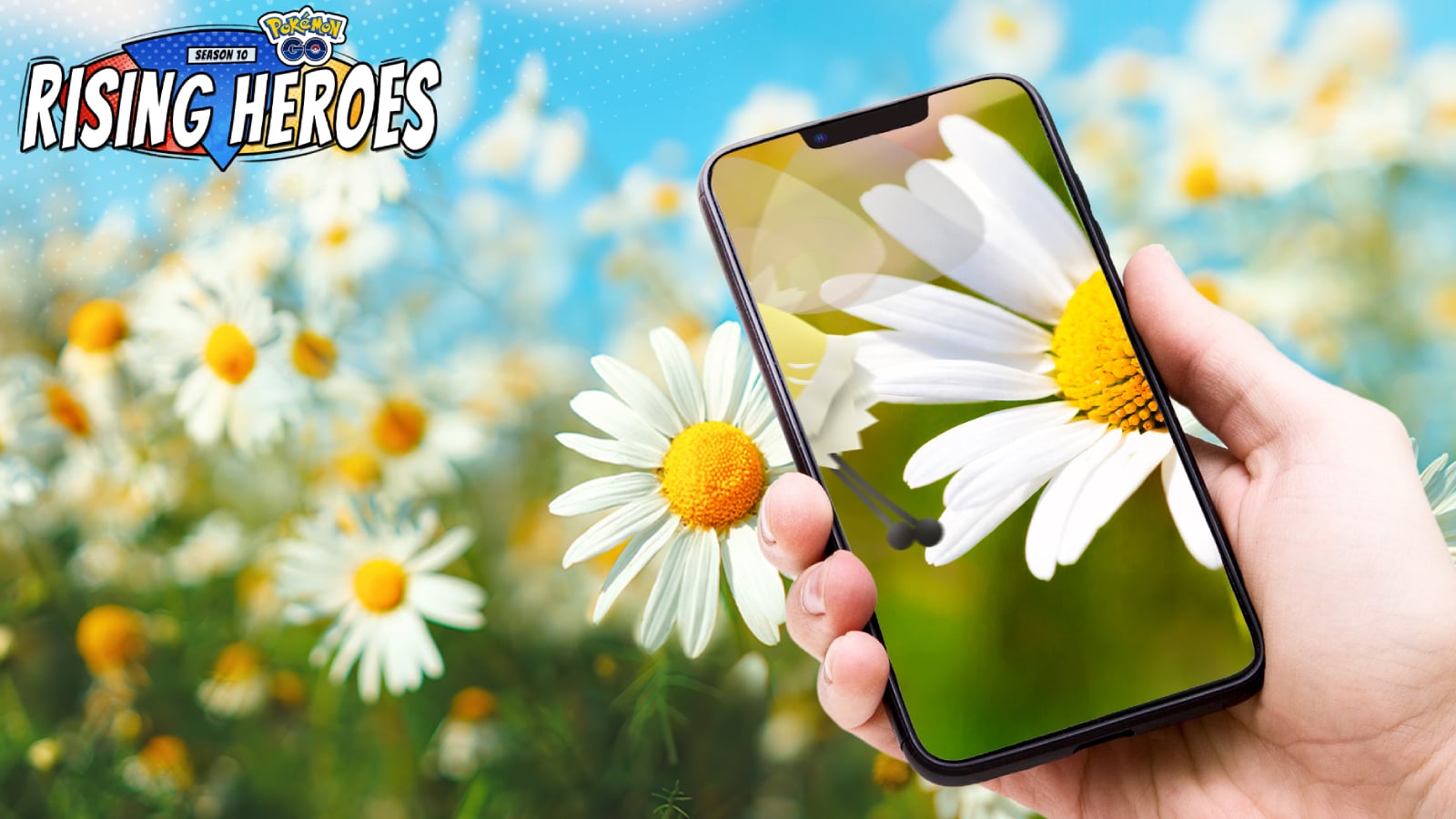 The Pokémon Go Korea Twitter account shared an image showing a field of daisies, along with a hand holding a phone zooming in on a daisy and showing the back half of what appears to be a Pokémon’s body. It also included a caption saying: first appearance with a very small body but a big presence!