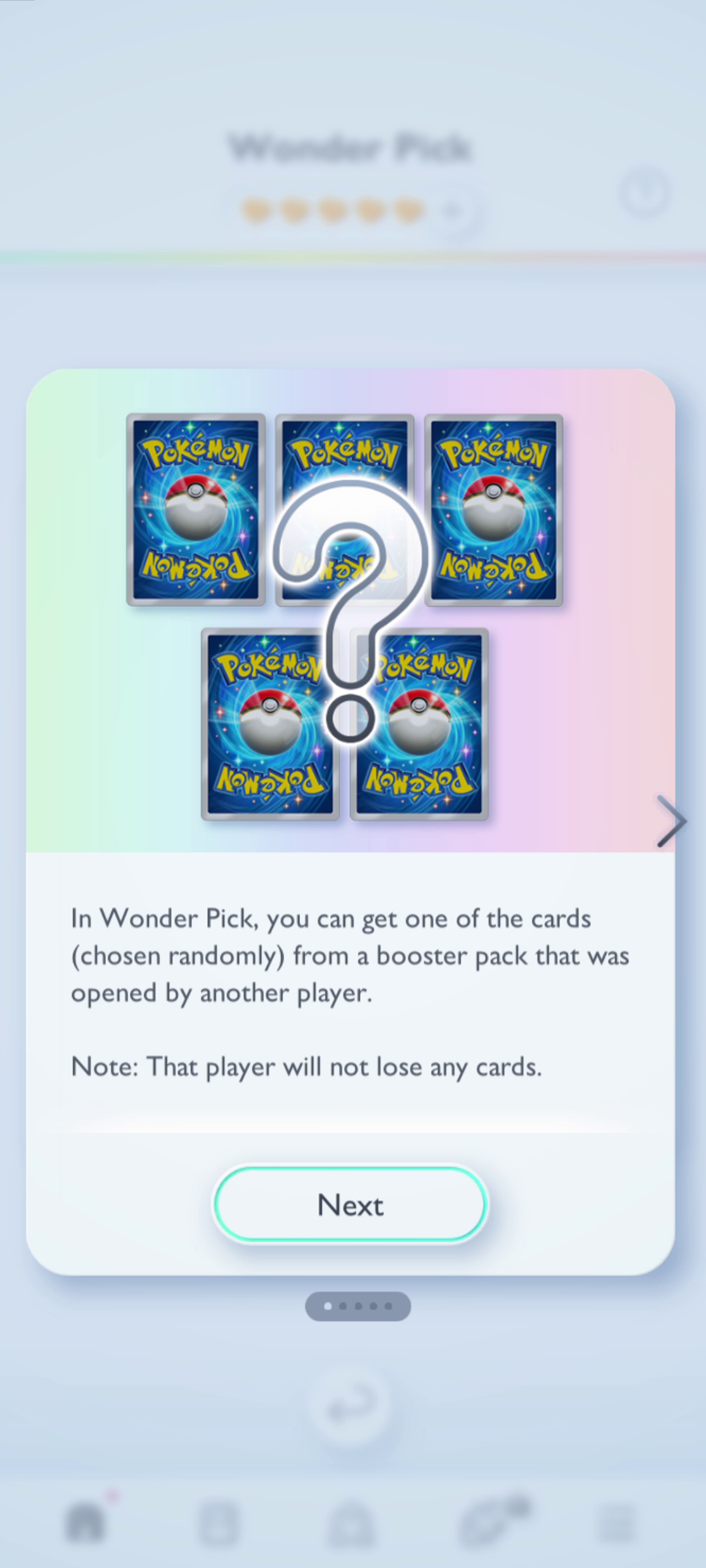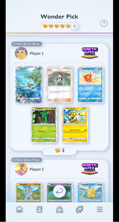 Wonder Pick lets you select one card from a booster pack another trainer has opened, but you can only pick one of five randomly selected cards from the other trainer’s pack—which still grants better odds of pulling a rare card than opening a random pack and hoping for the best.