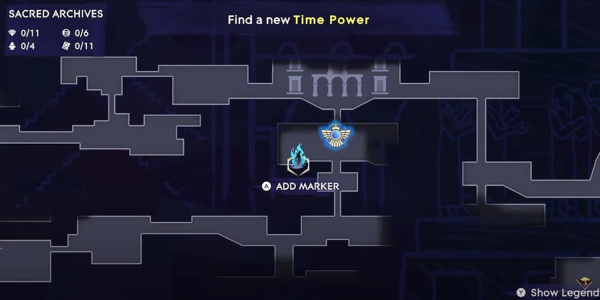 Once you’ve advanced enough in The Lost Crown, you’ll acquire the Shadow of Simurgh time ability. This will open up a new and unexplored route on the map, making the Sacred Archives accessible for exploration. The puzzle chamber is located to the west of the Secret Archives zone. A blue wall blocks the entrance that forces you to take a detour around the chamber. Simply continue along the hallways, first going west, then turning south and east, until you reach the lower part of the chamber. There, you will find the entrance to the first chamber.