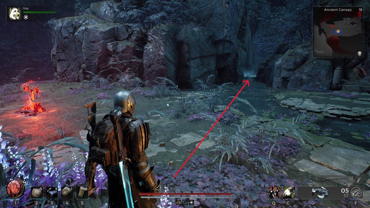 When you start The Forgotten Kingdom DLC in One Shot mode, you start in the Ancient Canopy. Straight ahead is a locked door, and on your left is a path that leads up a hill. Take the left path while defeating enemies that come at you. Be careful, as there’s a giant moth enemy that smashes the ground repeatedly and can quickly drain your entire health pool, even on the lowest difficulty.