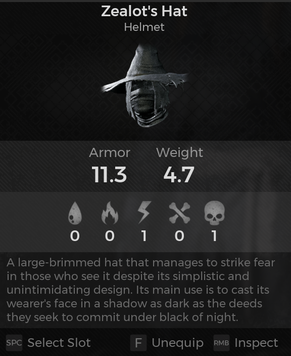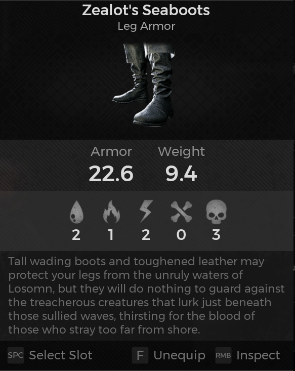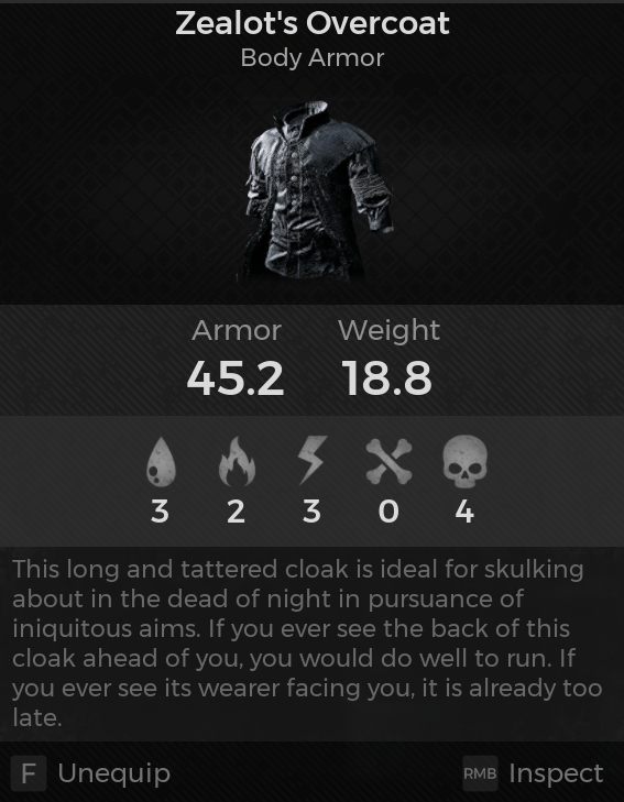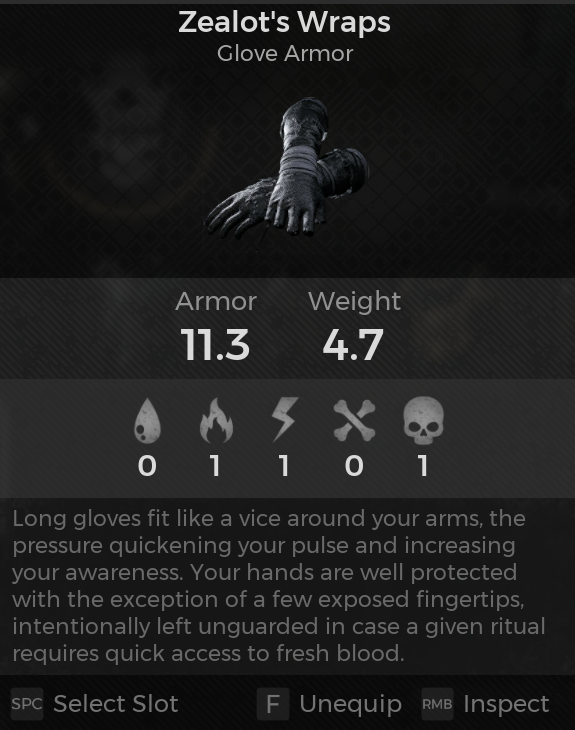 Certain clothing items also provide resistances to status effects, like Corrosion and Bleeding. Each item in the Zealot’s armor set provides slightly different protections, as shown in the images above.