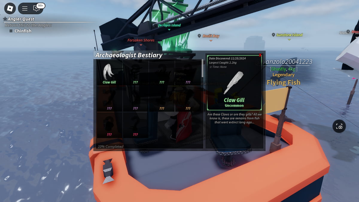 To find Dr. Finneus in Roblox’s Fisch and start the bone hunting, you need to locate his boat. To do that, meet your Shipwright to spawn your ship and make your way toward the middle of the Snowcap and Terrapin islands. Just like islands, the location will show up once you’re closer to the area, and it should be relatively easy to track him. After you find the scientist, you can talk to him to start the quest and access your Archaeologist bestiary.