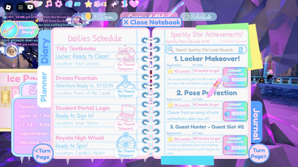 Apart from the Halo, the Diamond and XP rewards are also worth grinding in Royal High, so it’s a worthwhile investment of time to come back and get your hands on the elusive Halo. If you’re busy with something else and want to keep a close eye on the reset timer while being inside the game, you can open your planner and turn to page two to see the timer live. That way you can make your way to the Dream Fountain at the right time, increasing your efficiency by making a wish and getting your hands on the elusive Halo.