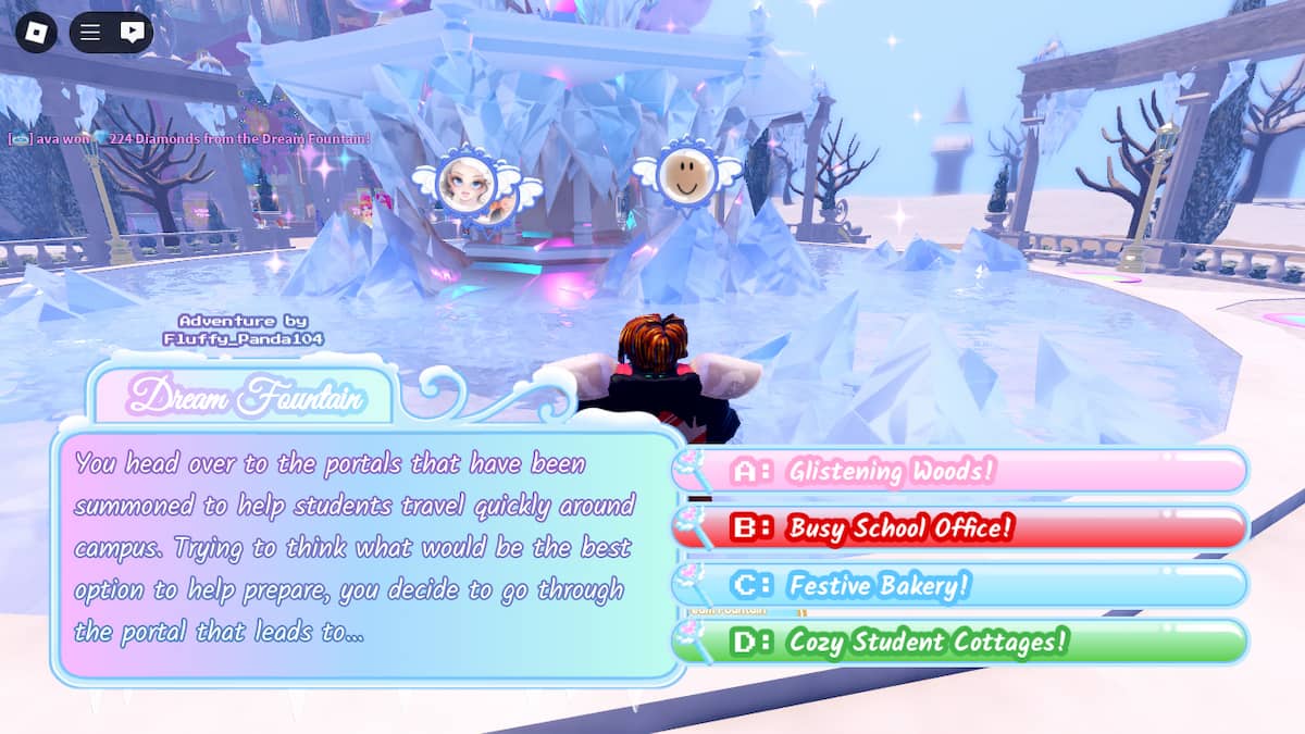 Once you reach the Royale High’s main lobby, you should spot the Dream Fountain in front of you. The Dream Fountain is located in the center of the map and is quite huge, so it’s hard to miss. You can click on the Dream Fountain and make a wish. After that, you will have to click on the Open your Eyes option and it will trigger a storyline.