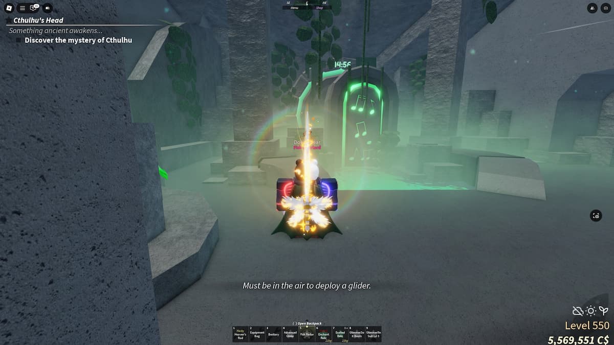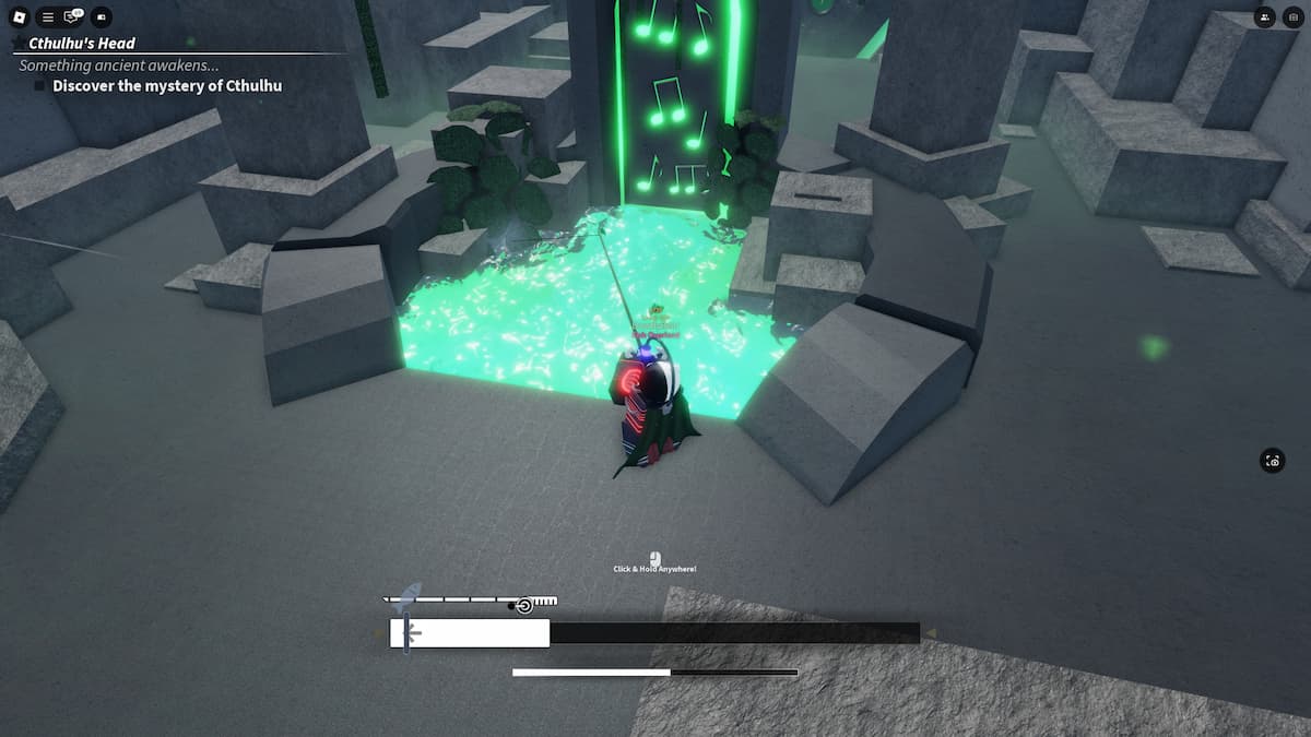 First, head to the room on the right. There is an obby with platforms shaped like mega tokens. At the end of this obby, there is a scary-looking Cthulhu Head. Interact with the head, and it will play and show eight different notes. You need to either write down, video record, or remember the order of the notes (we wrote them down).