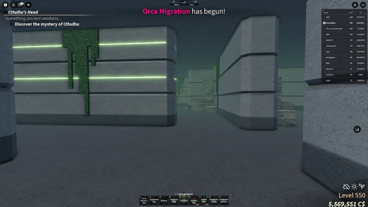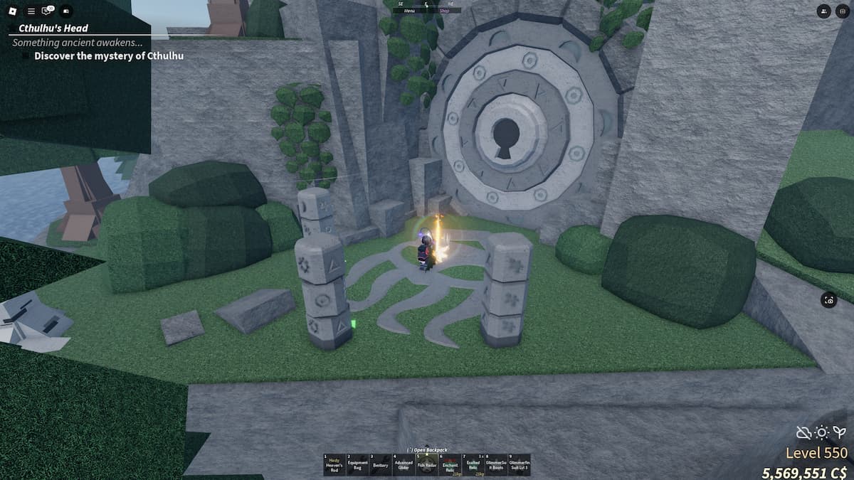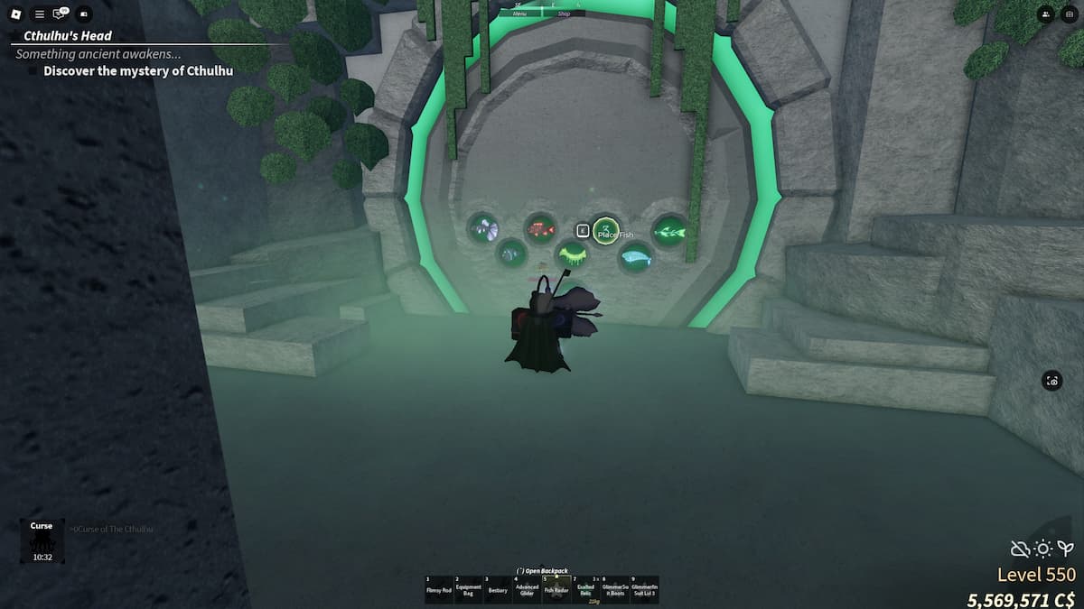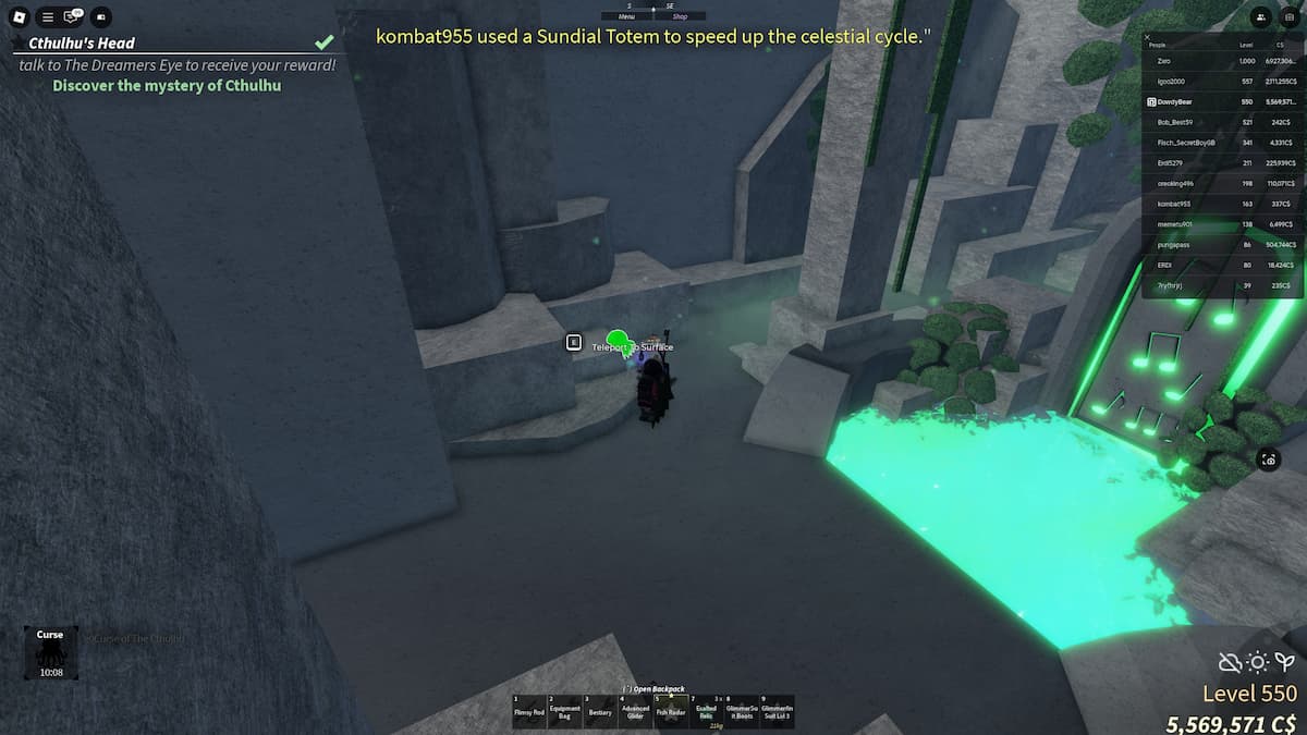 Once you have all eight fish in your inventory (or in your hotbar), you need to hold each fish in your hand and then interact with the stone by the pool. When you interact with the stone while holding a fish, you’ll hear and see one of the notes you saw earlier from the Cthulhu Head. Check your notes or recordings and see what the position of that note was.