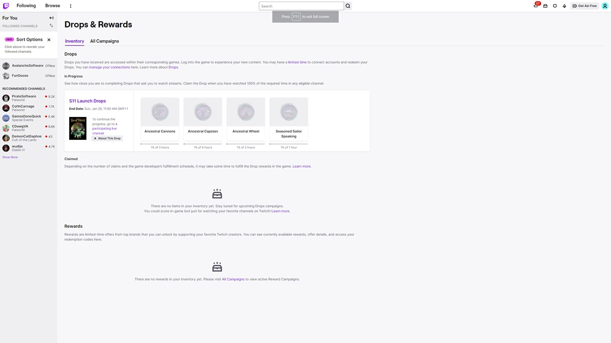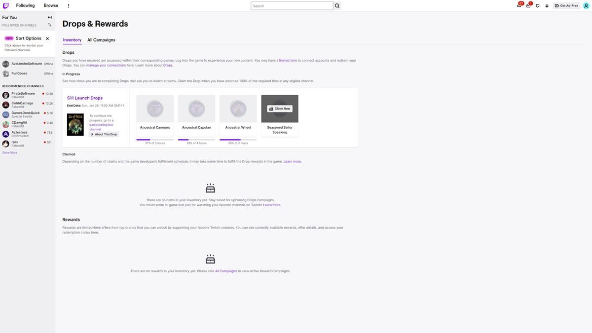 We recommend leaving both of these windows open and do something else. Occasionally, check and see if the Twitch Streamer is still playing the game and refresh the Drops and Rewards page to see how your progress is going.