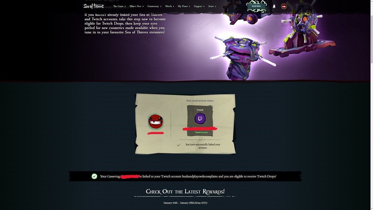- You’ll be taken back to the Sea of Thieves website, where you’ll again see your gamertag and the Twitch symbol, but now it will say that you have successfully linked your account.