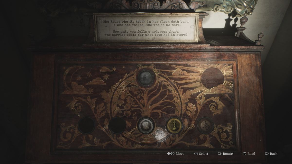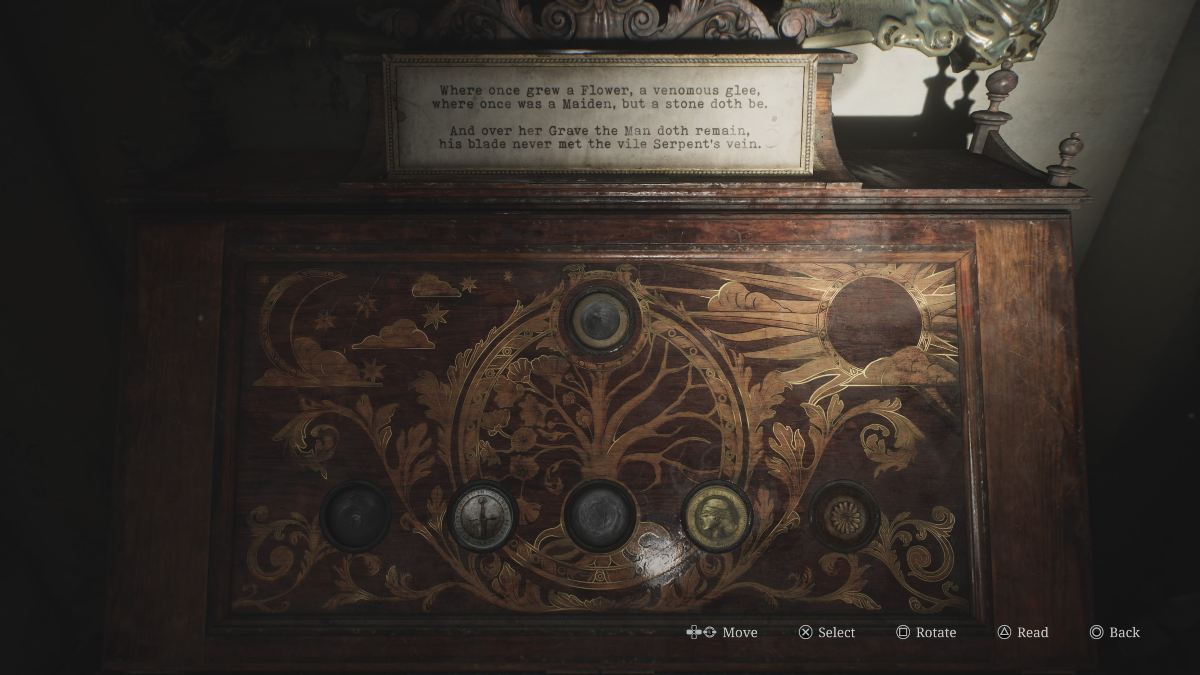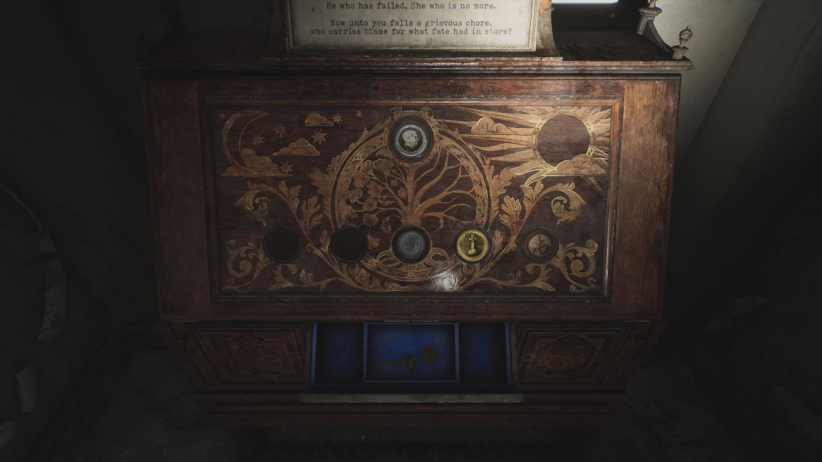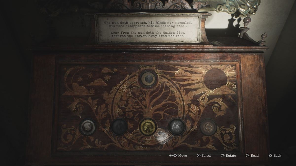 Return to the Reception room of Wood Side (where you can save the game) now that you have all three coins. The Coin Cabinet puzzle tells the tale of the Maiden and Man. You must put the three Coins in the correct slot, corresponding to each part of the tale. Each Coin can be flipped to reveal a different engraving. Here is the order: