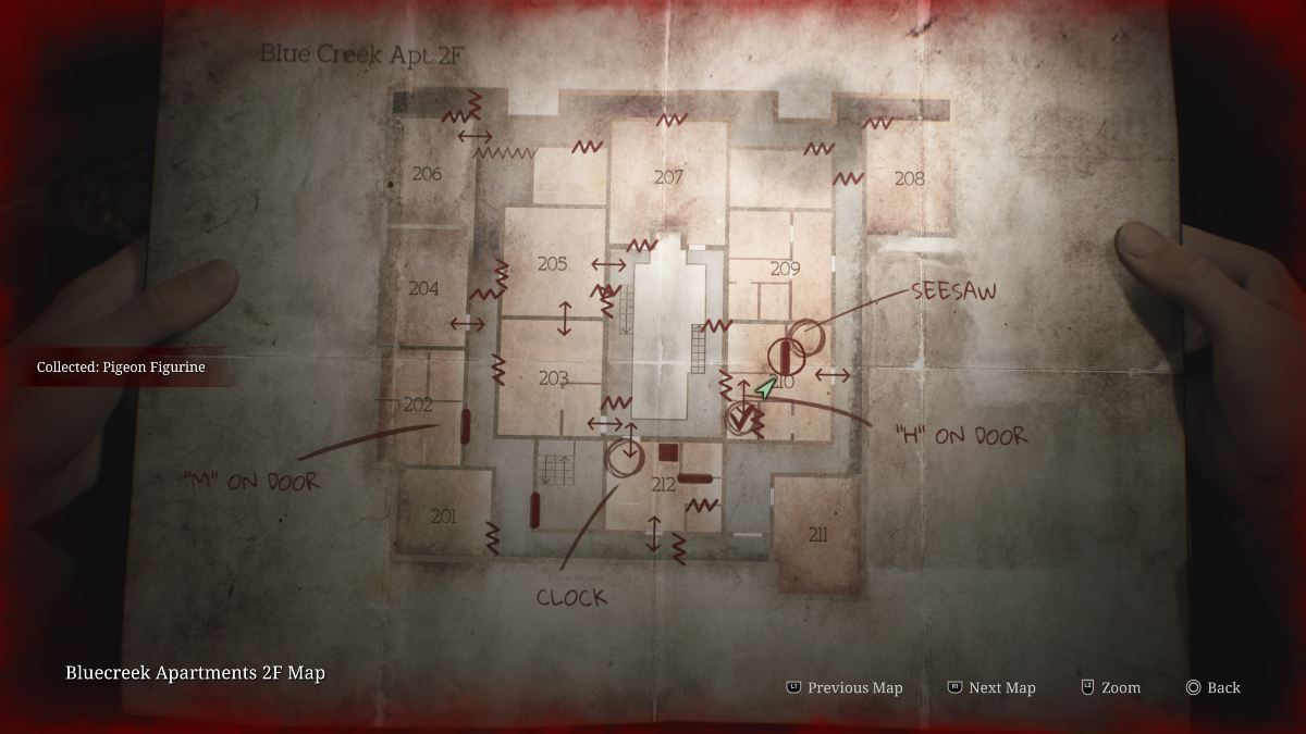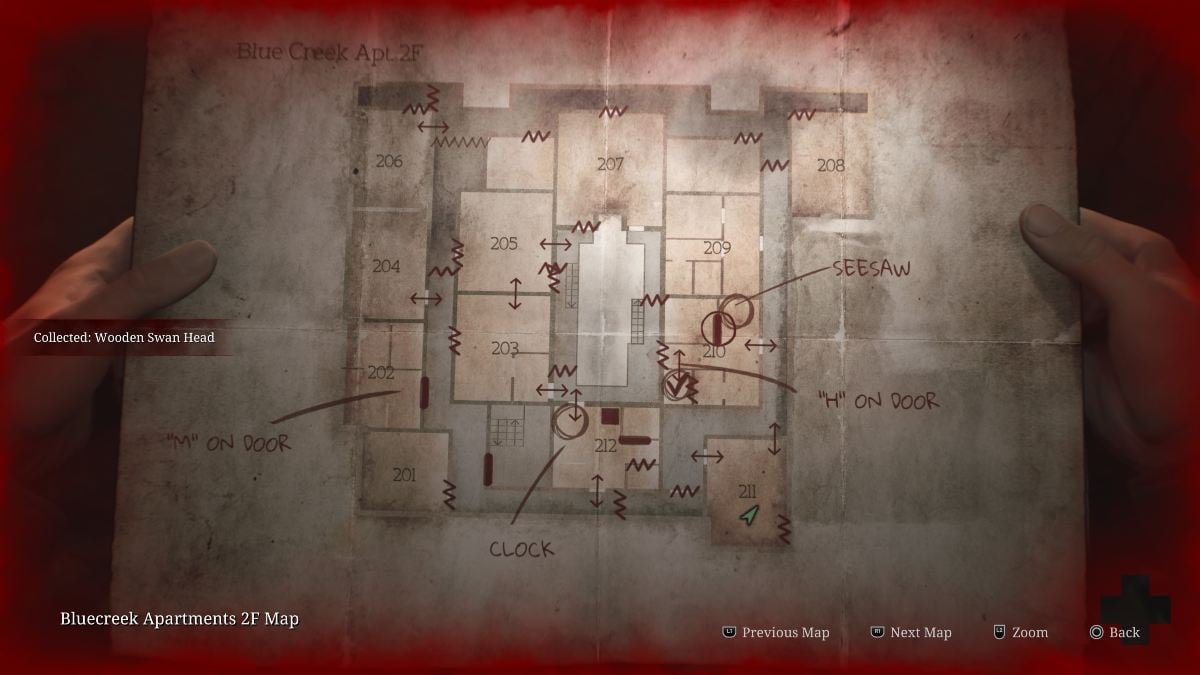Find the Wooden Swan Head inside Room 211, after which you can find the Malformed Figurine Part from the bathroom of 209 (break the glass in the shower to pull the item from the rope). Combine these items back in the H Room and place the Swan on the second slot to balance the seesaw. The puzzle gives you the Winged Key, which lets you drop into Blue Creek’s first floor. From here, go to Room 109 to find Angela, her knife, and the Key of Resilience (which is a bit dramatic for a key name).