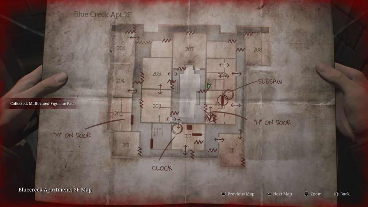 The Blue Creek Apartments centers around the Grandfather Clock puzzle. Instead of simply opening a path behind the clock after solving it (as seen in the original), the other world’s multi-layered clock puzzle takes center stage as an appetizer to the Pyramid Head’s boss fight. The clock requires its hands to function. You need to find the Hour, Minute, and Second hands to complete the puzzle. The best place to start is in Room 307.