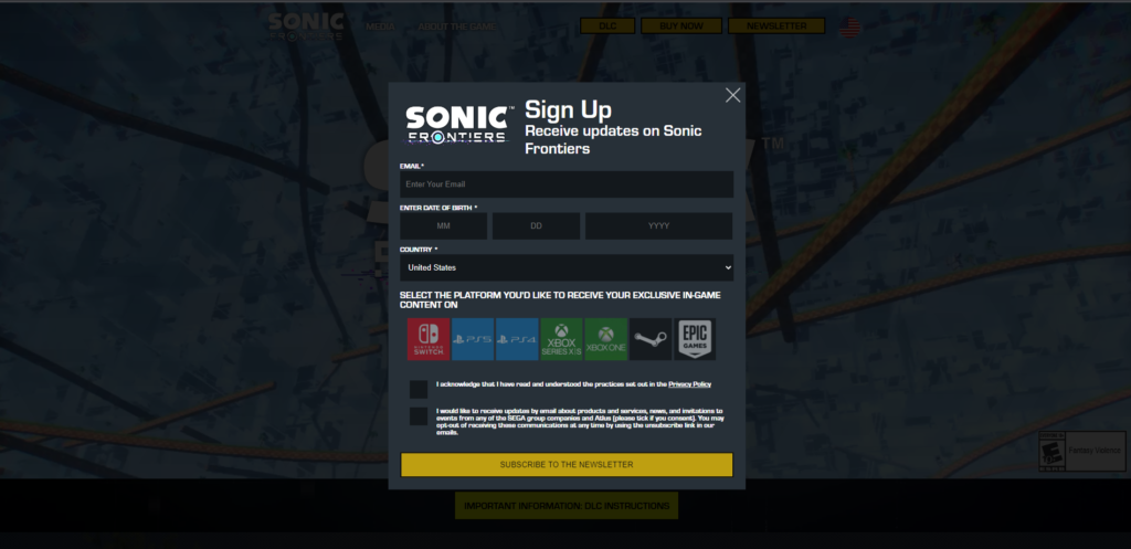 After accessing the game’s official website, players should click the ‘newsletter’ button. After doing this, a small popup will appear and ask players to put in their information. Most importantly, players should ensure they have input their correct email and the platform they purchased Sonic Frontiers on. After inputting your information, you will be sent a confirmation email, where you must confirm that you listed the correct email account by clicking on the corresponding link.