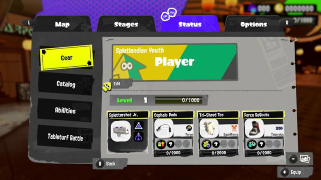 Nintendo has made it easy to change up your splashtag. If you want to leave a mark on your splashtag, hit up the city of Splatsville. Press ‘X’ to see the menu and then press ‘R’ to move over to the Status tab.