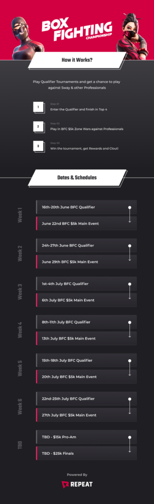 The tournament format will always be Box Fight, Realistics, Zone Wars, and Build Battle, but will rotate between one-vs-one, two-vs-two, or three-vs-three depending on the week. On weeks where duos or trios are used, each Repeat qualifier winner and each influencer will choose their own teammates to compete with in that week’s bracket.