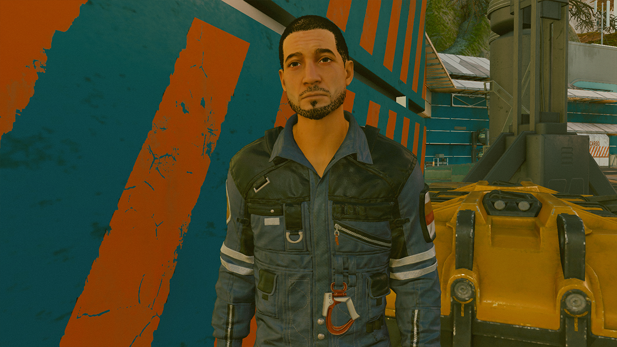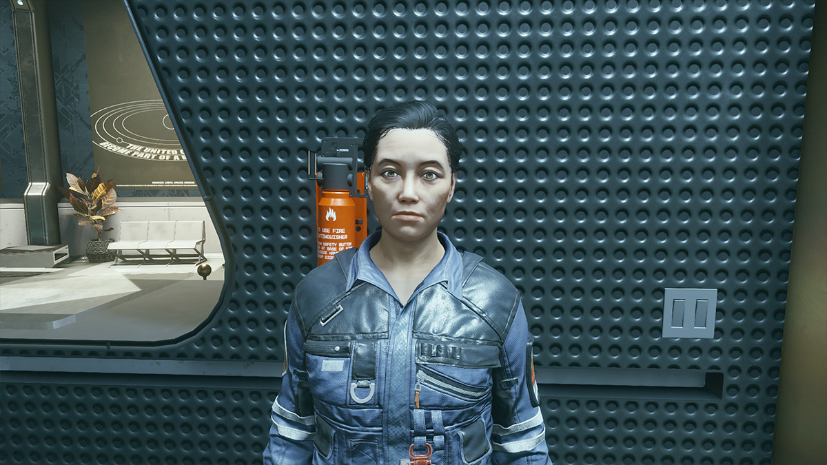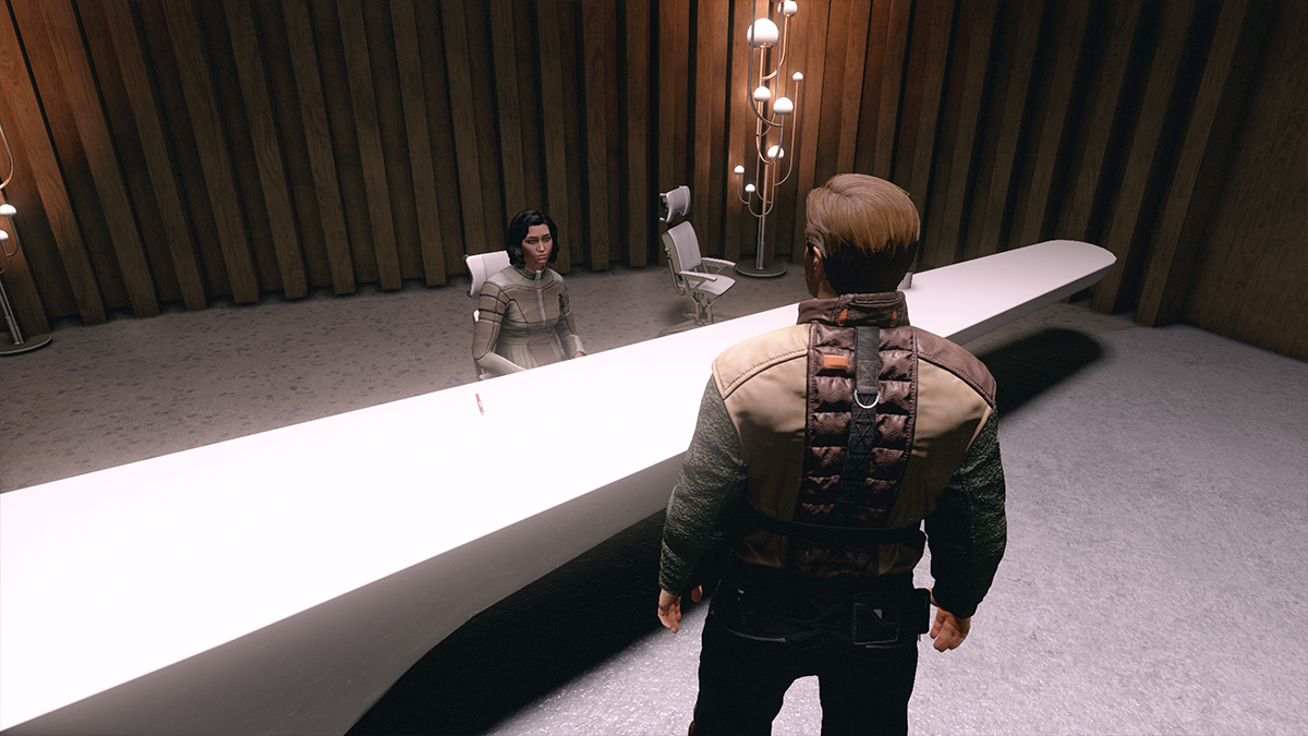 After you’ve met the members of Constellation at the Lodge head back to the spaceport. Right at the ramp for pad A, you’ll see a man talking to two guards. You’ll overhear them saying that he doesn’t have a diplomatic visa. The man, Representative Chisolm, is a diplomat from the Freestar Collective. Speak to Chisolm and offer to go to the Freestar embassy for help.