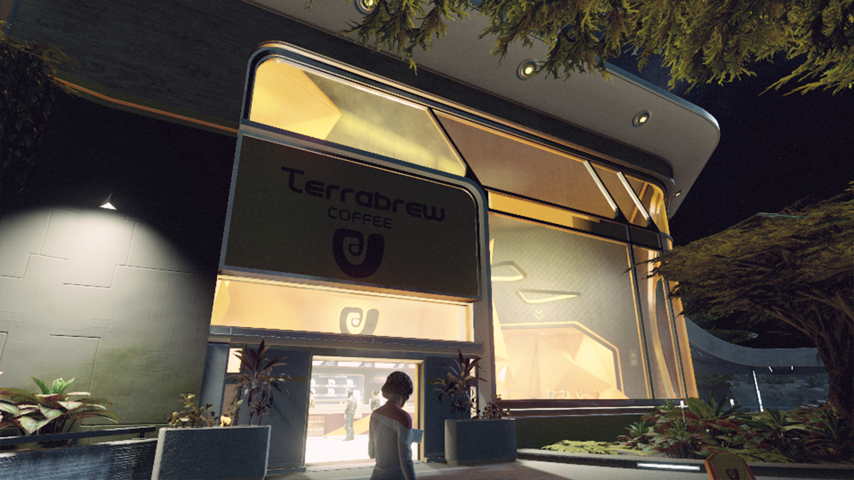 Once you’ve started the quest, turn around, hop back on the NAT, and take it to the commercial district. You’ll see a Terrabrew to the left of the station.