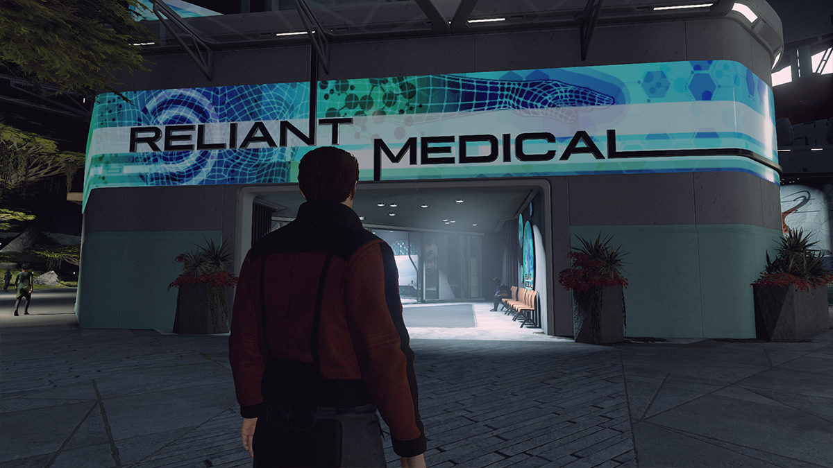 He’ll ask if you can help a local, Tahir Vala, get home after recovering at the local medical center. Andy will pay you 2,000 credits up front. Follow the waypoint and you’ll find Tahir sitting outside the medical center.