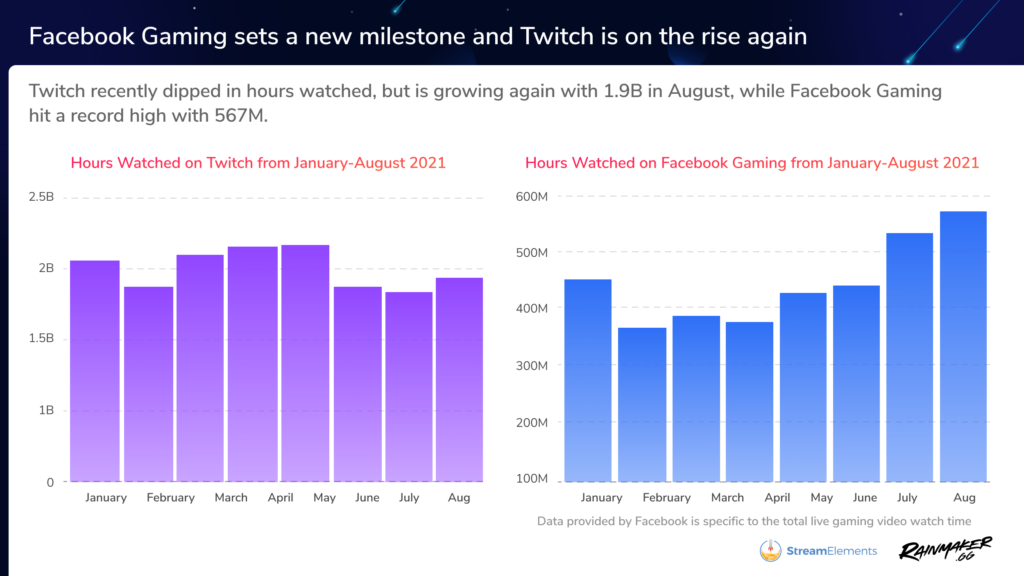 For Facebook, this continues a strong period of growth dating back to April, hitting a record high 567 million hours watched in August just one month after breaking the 500 million hour mark in July, according to Rainmaker.gg, StreamElements’ analytics partner.