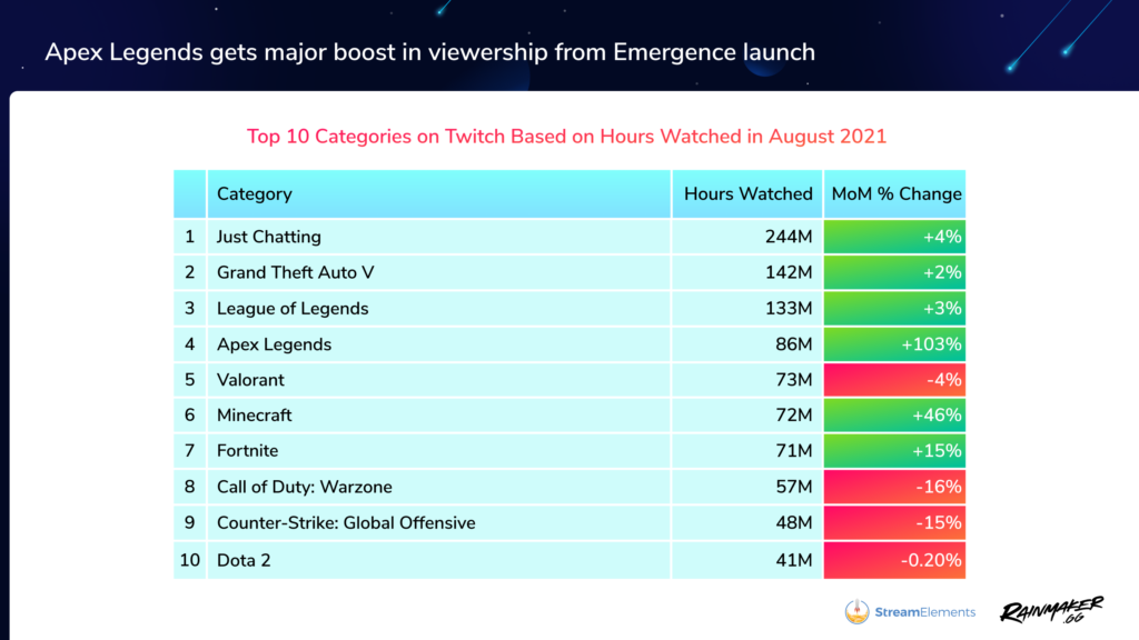Apex Legends is the biggest mover of the month, having jumped more than 103 percent in viewership thanks to the Emergence launch, sitting in fourth place at 86 million hours watched. VALORANT rounds out the top five at 73 million hours.