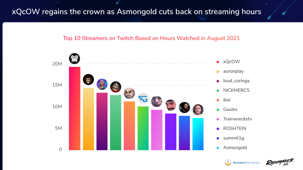 In terms of individual streamer performance, xQc reclaimed his Twitch viewership throne after Asmongold broke a seven-month streak, sitting at just under 20 million hours watched.