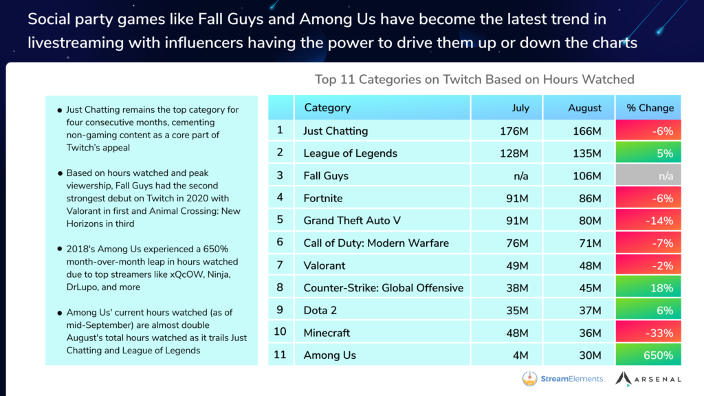Growth for streaming this past month has come in the form of increased hours watched for “party games” like Mediatonic’s obstacle racing game Fall Guys and the social deduction game Among Us.