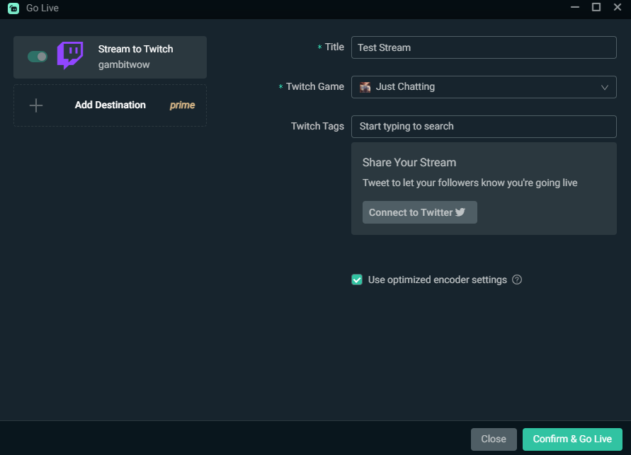 For instance, if you use Streamlabs OBS, after clicking the Go Live button, the program asks you to create a stream title and select a category to be under. In that same pop-out screen, there is an option to add Twitch tags to your broadcast. Other broadcast software may be set up slightly differently.