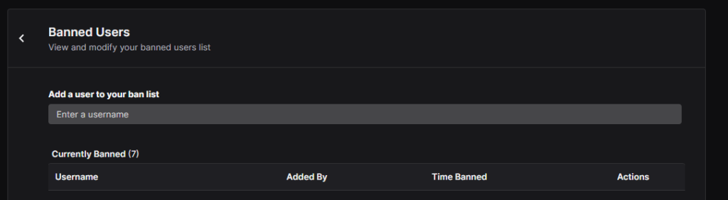 While there, you can add more people to your ban list by typing usernames into the text bar at the top of the page. Additionally, you can sift through all of the people who are banned in your chat to see if you might want to consider unbanning those people.