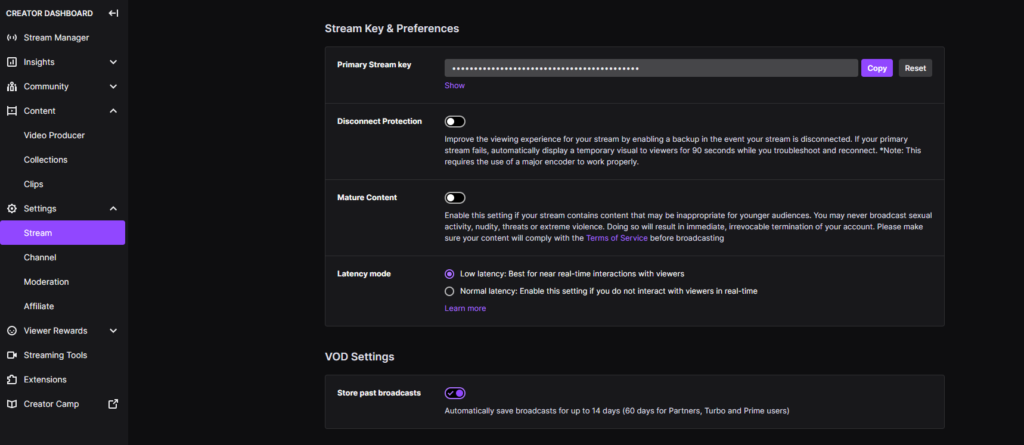 This will take you to a new page that will allow you to establish preferences for Latency, VODs, and Clips.